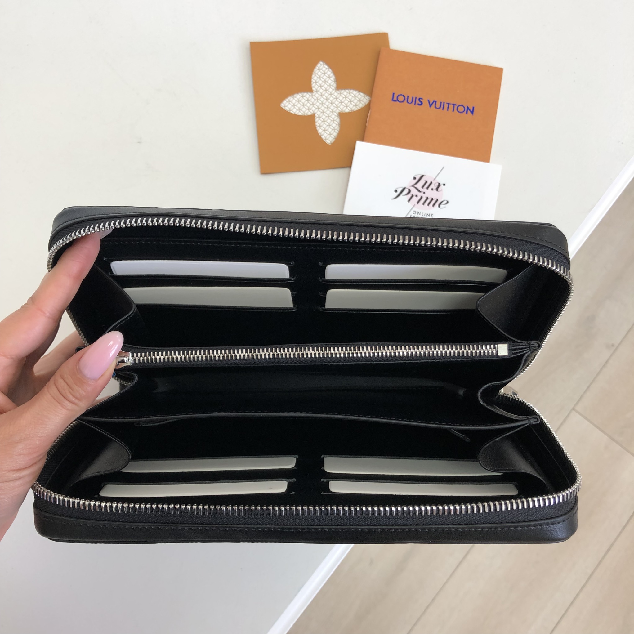 Это элегантное портмоне Louis Vuitton LUX-18489 выполнено в классическом черном цвете и имеет текстурированную поверхность, характерную для изделий бренда. Его минималистичный дизайн дополняется узнаваемым тиснением логотипа, что подчеркивает роскошный стиль. Портмоне идеально подходит для хранения документов, карт и наличных, обеспечивая порядок и безопасность ваших ценных вещей.