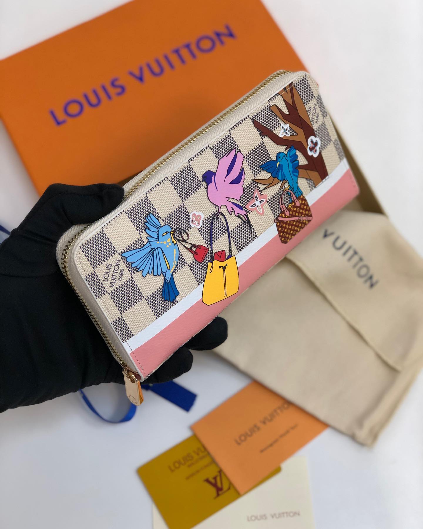 Портмоне Louis Vuitton LUX-37694 – это изысканный аксессуар, сочетающий классический дизайн бренда с оригинальным художественным оформлением. Модель выполнена в узнаваемом стиле Louis Vuitton, украшена милым принтом с птицами, сумками и цветами на фоне фирменной канвы. Стильное портмоне идеально подойдет для хранения наличных, карт и других необходимых мелочей, добавляя вашему образу элегантности и индивидуальности.