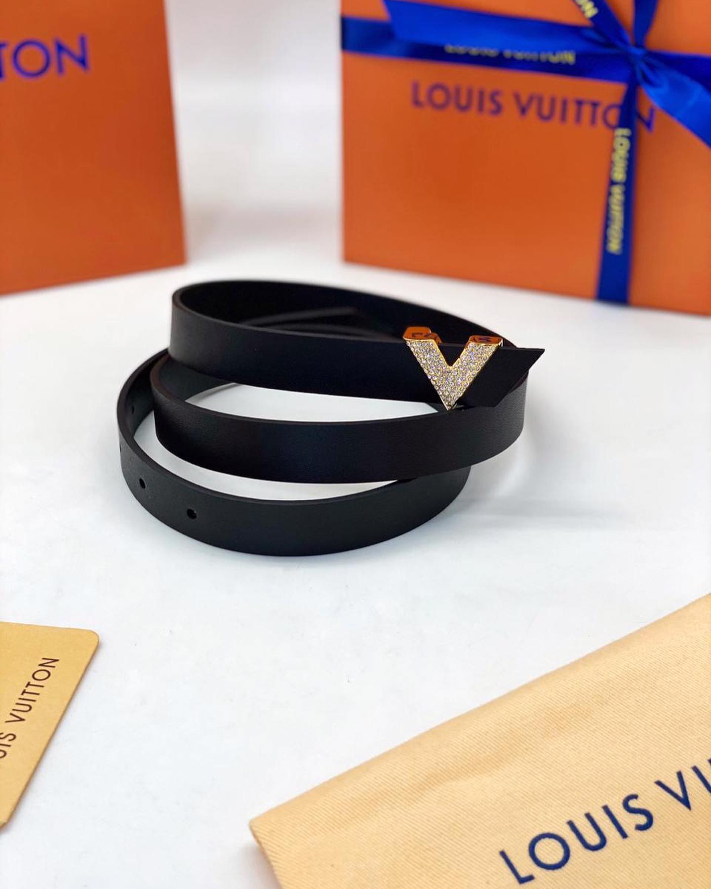 Ремень женский Louis Vuitton LUX-41580 – это элегантный аксессуар, выполненный в классическом черном цвете. Он идеально подчеркнет ваш стиль и добавит изысканности любому образу. Ремень декорирован узнаваемой монограммой бренда в виде буквы "V", инкрустированной сверкающими кристаллами, что придает ему особую роскошь.