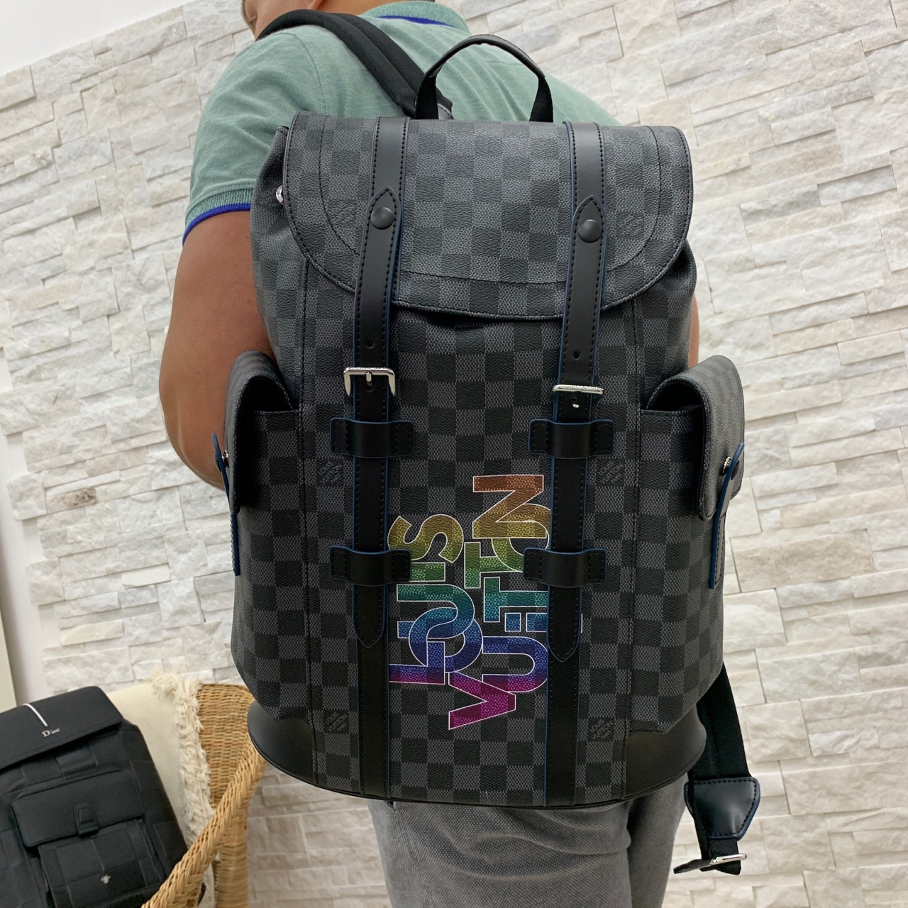 Рюкзак мужской Louis Vuitton LUX-20976 представляет собой стильный и функциональный аксессуар, выполненный в классической клетчатой расцветке бренда. Этот рюкзак сочетает в себе элегантность и практичность, делая его идеальным выбором для современного мужчины. На его передней части расположен яркий радужный принт с названием бренда, добавляющий изделию уникальности.