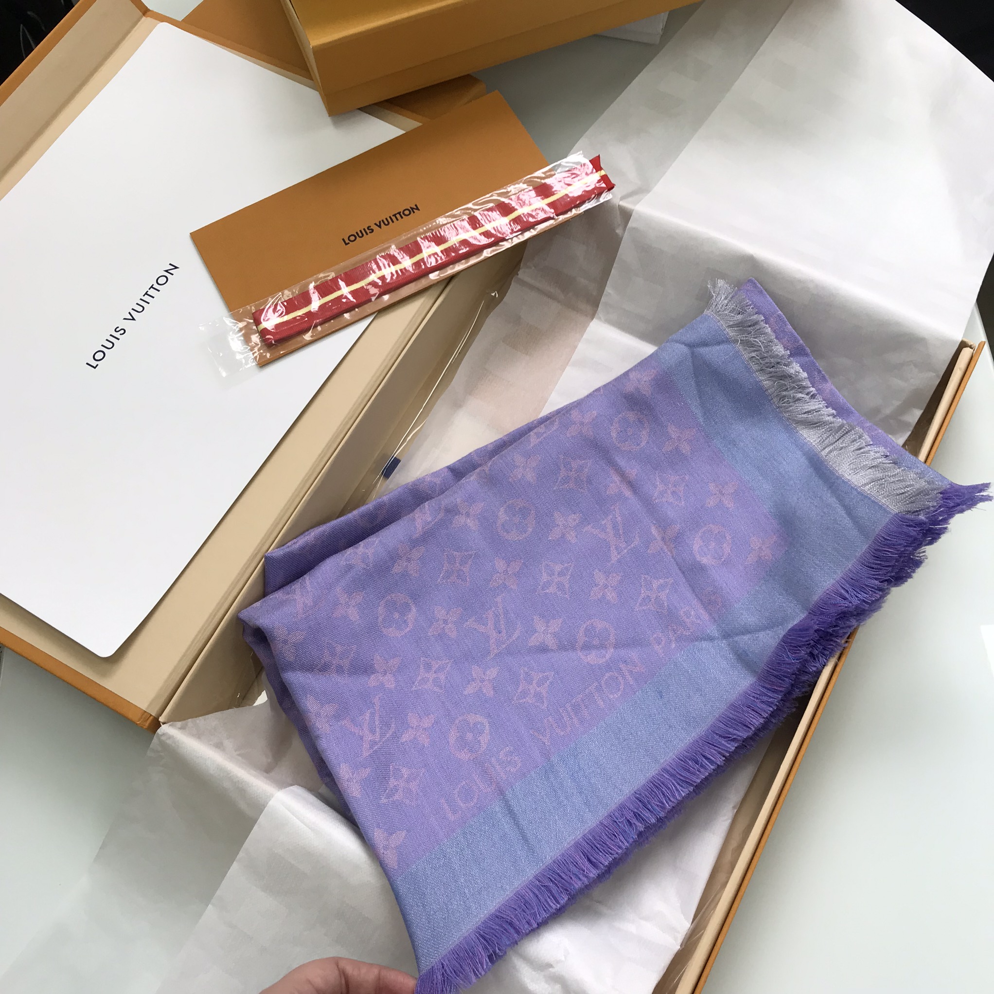 Элегантная шаль Louis Vuitton LUX-15974 выполнена в нежном лиловом и голубом оттенках, украшена культовым монограммным принтом бренда. Этот стильный аксессуар идеально дополнит как повседневные, так и вечерние образы.