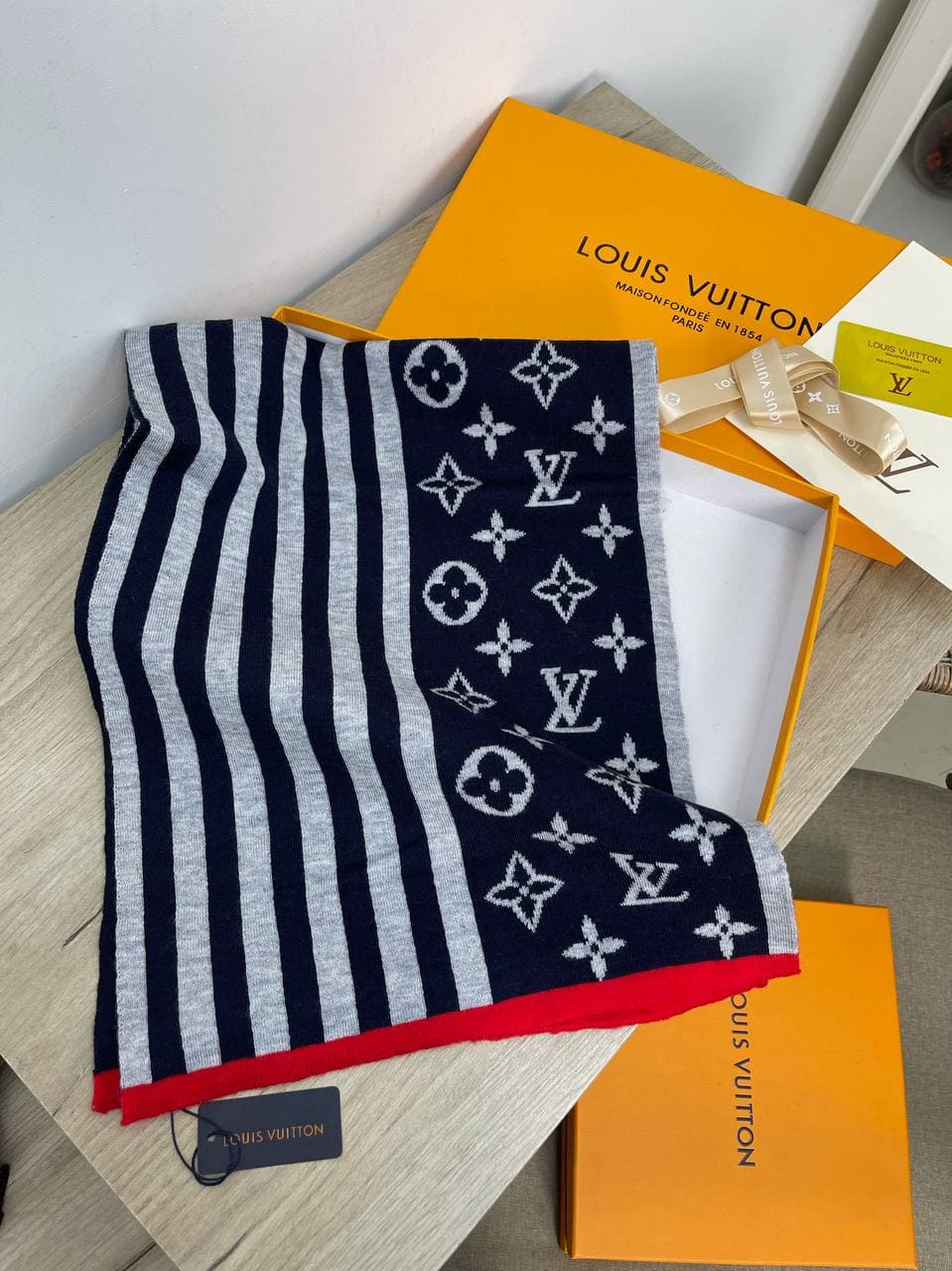 Шарф Louis Vuitton LUX-56638 представляет собой стильный аксессуар, выполненный в классическом дизайне. Сочетание темно-синего фона с контрастными полосами и фирменным монограммным принтом Monogram Flower и LV создает элегантный образ. Красная кромка добавляет яркий акцент, делая шарф запоминающимся. Этот шарф идеально подходит для создания завершенного образа в прохладное время года.