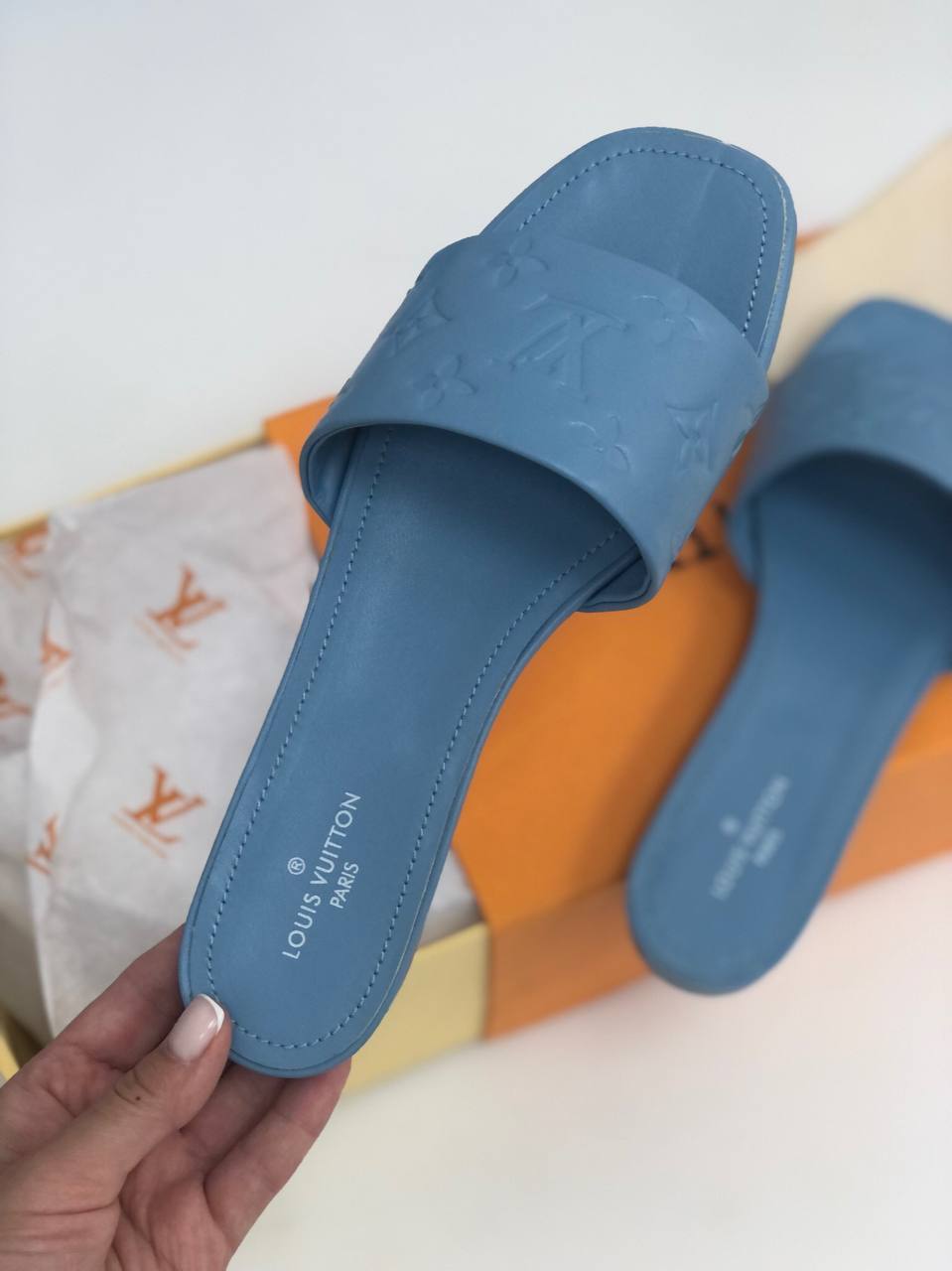 Эти шлепанцы Louis Vuitton LUX-46534 представляют собой стильный и элегантный выбор для теплого времени года. Модель выполнена в лаконичном дизайне с акцентом на узнаваемый монограммный узор бренда, нанесенный тиснением на верхнюю часть. Спокойный голубой цвет делает их универсальными для различных летних образов, подчеркивая изысканность и утонченность.