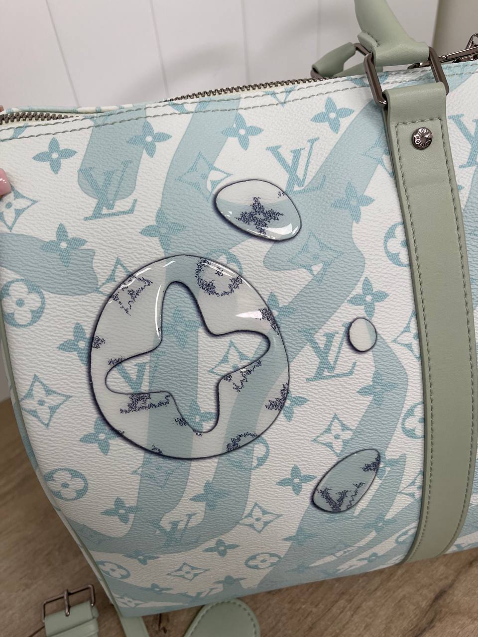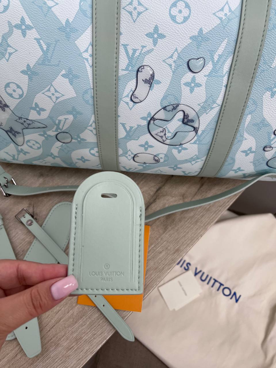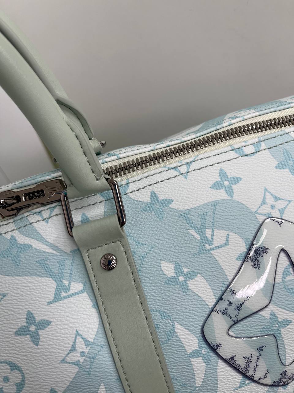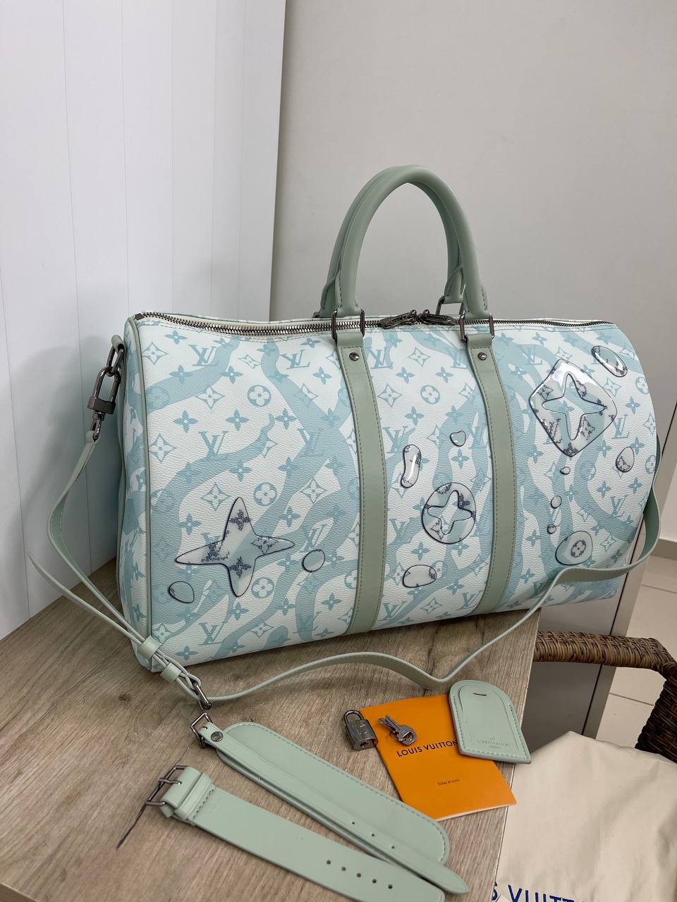 Сумка дорожная 50см Louis Vuitton LUX-93670 — это стильный и функциональный аксессуар для путешествий. Сумка выполнена в фирменном дизайне бренда, сочетающем в себе элегантность и практичность. Она имеет белый фон с голубым рисунком, дополненный деталями из кожи в тон.