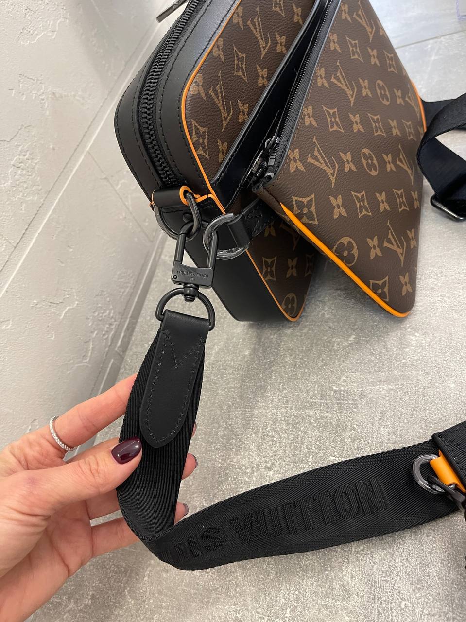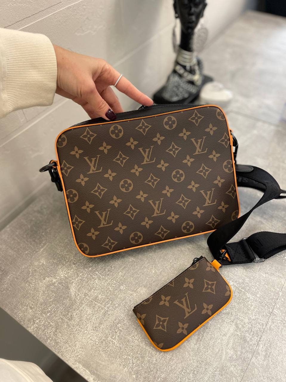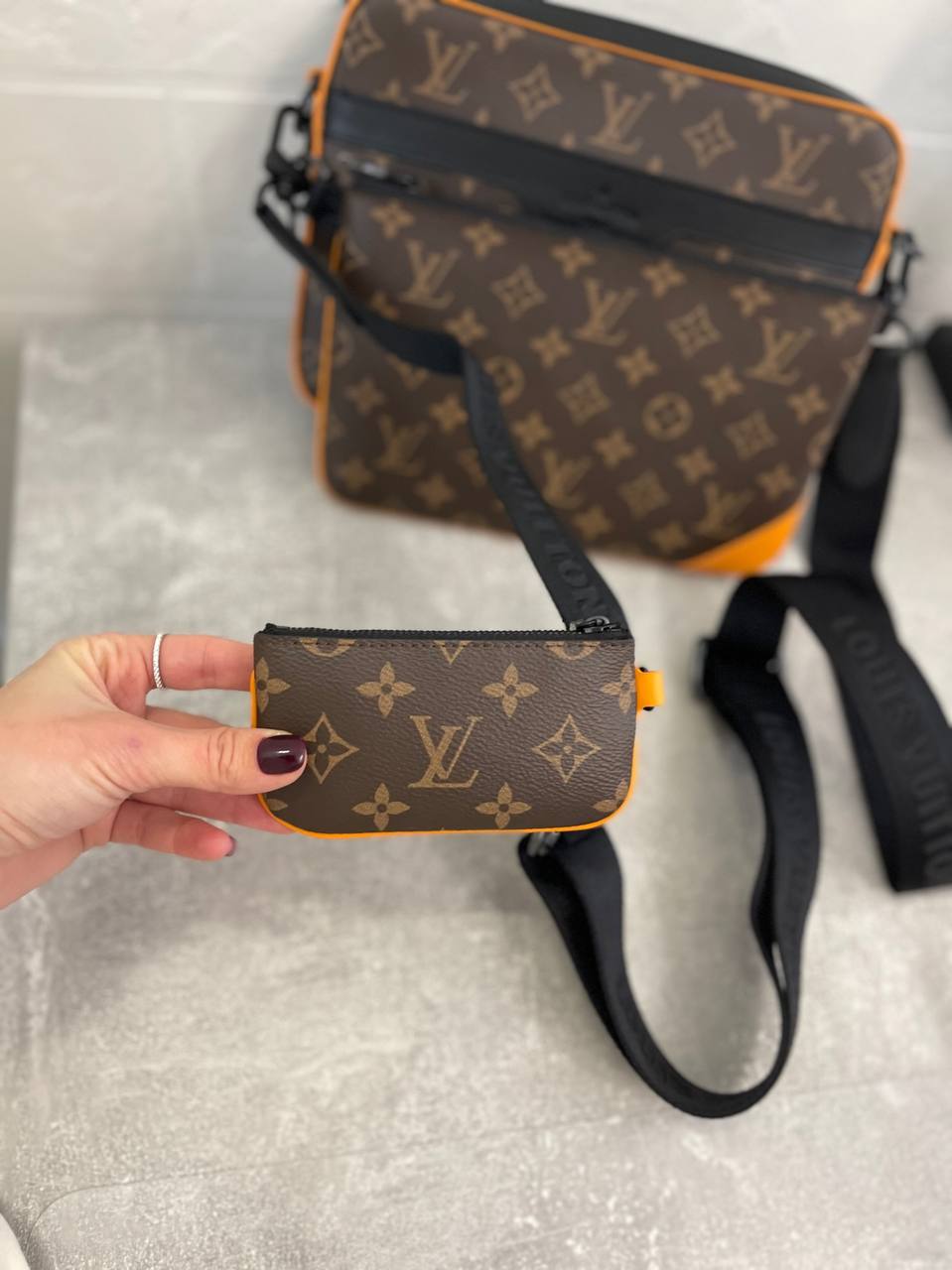 Сумка мужская Louis Vuitton LUX-98616 — стильный аксессуар для повседневного использования, выполненный в классическом стиле. Основной цвет — коричневый с монограммой, дополненный оранжевыми и черными деталями. Сумка имеет узнаваемый дизайн, который подчеркивает статус владельца.