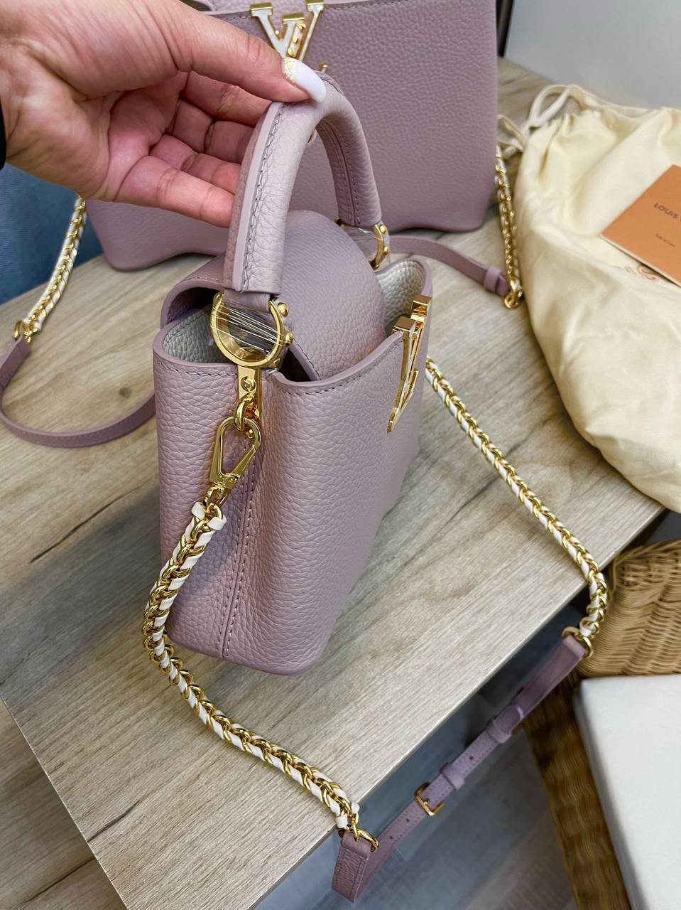 Сумка женская 21 cm Louis Vuitton LUX-95998 – это элегантный аксессуар от известного бренда. Сумка выполнена в нежно-розовом цвете, имеет уникальный дизайн с волнистым краем и золотистой фурнитурой. Она идеально подойдет для создания утонченного и стильного образа.