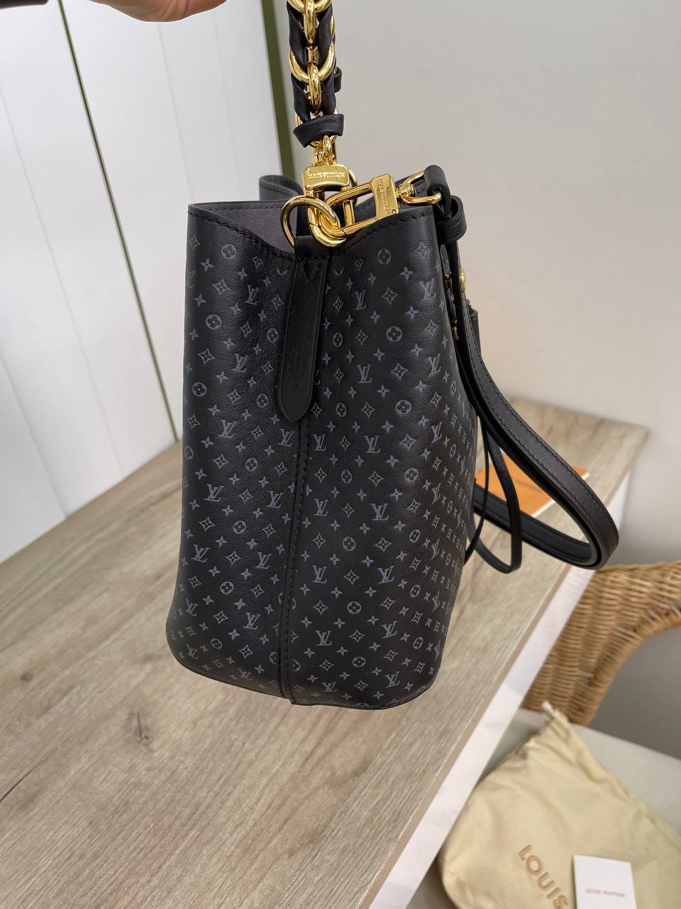 Сумка женская Louis Vuitton LUX-88930 представляет собой стильную сумку в форме ведра, выполненную в элегантном черном цвете. Она украшена монограммой бренда и золотистой фурнитурой, которая придает ей изысканный вид. Эта сумка идеально подходит для повседневного использования, сочетая в себе функциональность и роскошь.