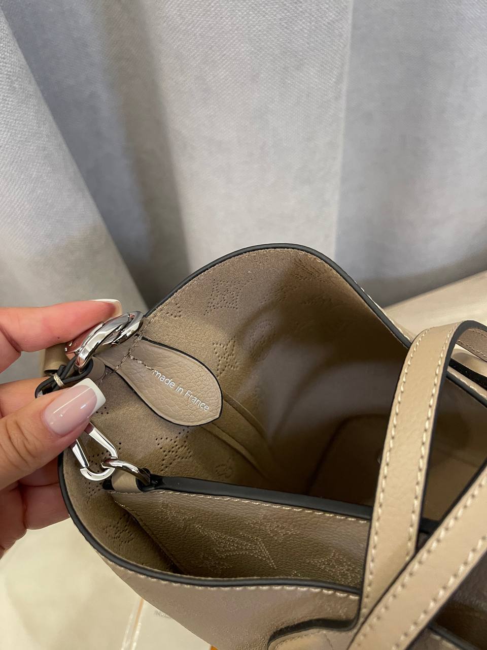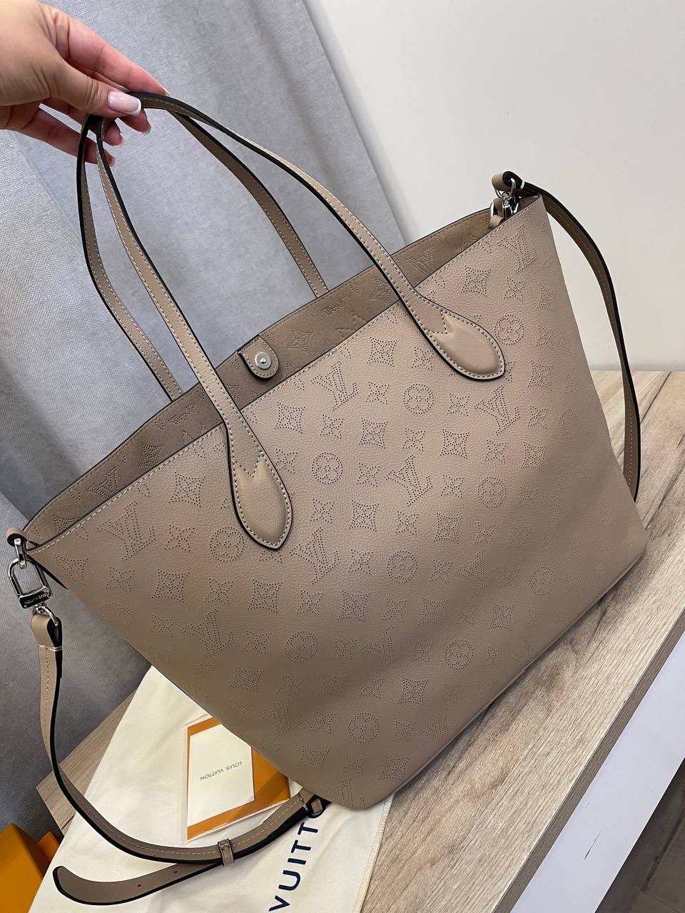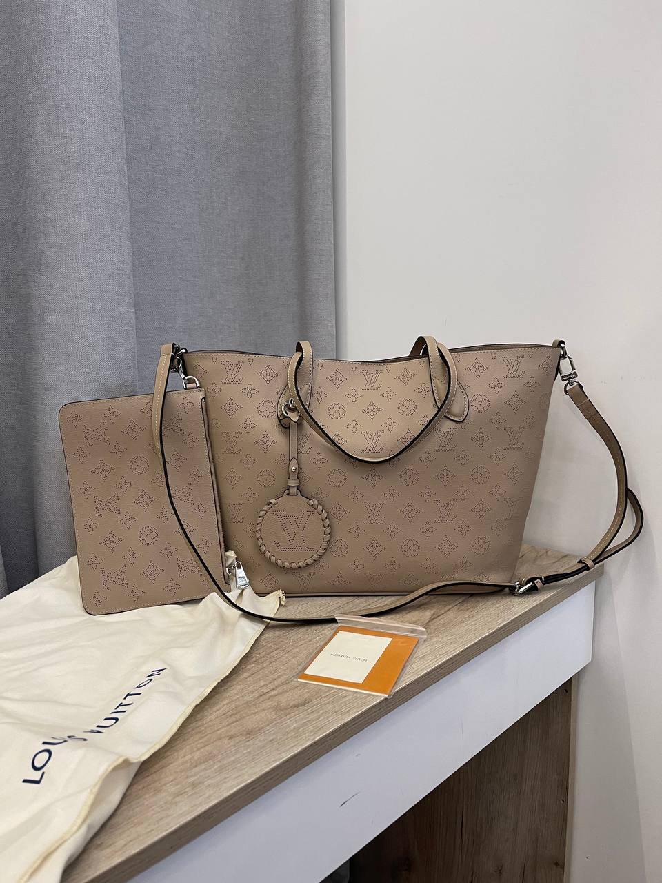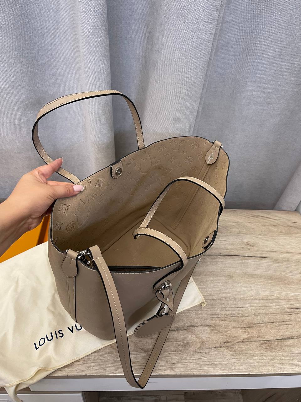 Сумка женская Louis Vuitton LUX-109741, представленная на изображении, — это элегантный аксессуар, выполненный в классическом стиле. Сумка выполнена в нейтральном бежевом цвете и имеет текстурированную поверхность с фирменным узором бренда. Она предназначена для повседневного использования, предлагая как стиль, так и функциональность.