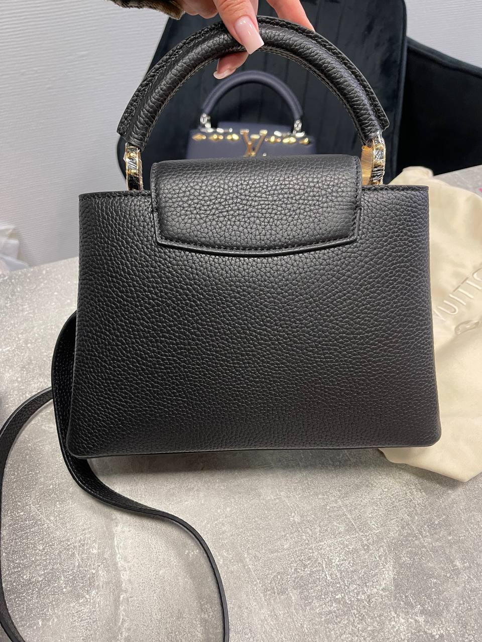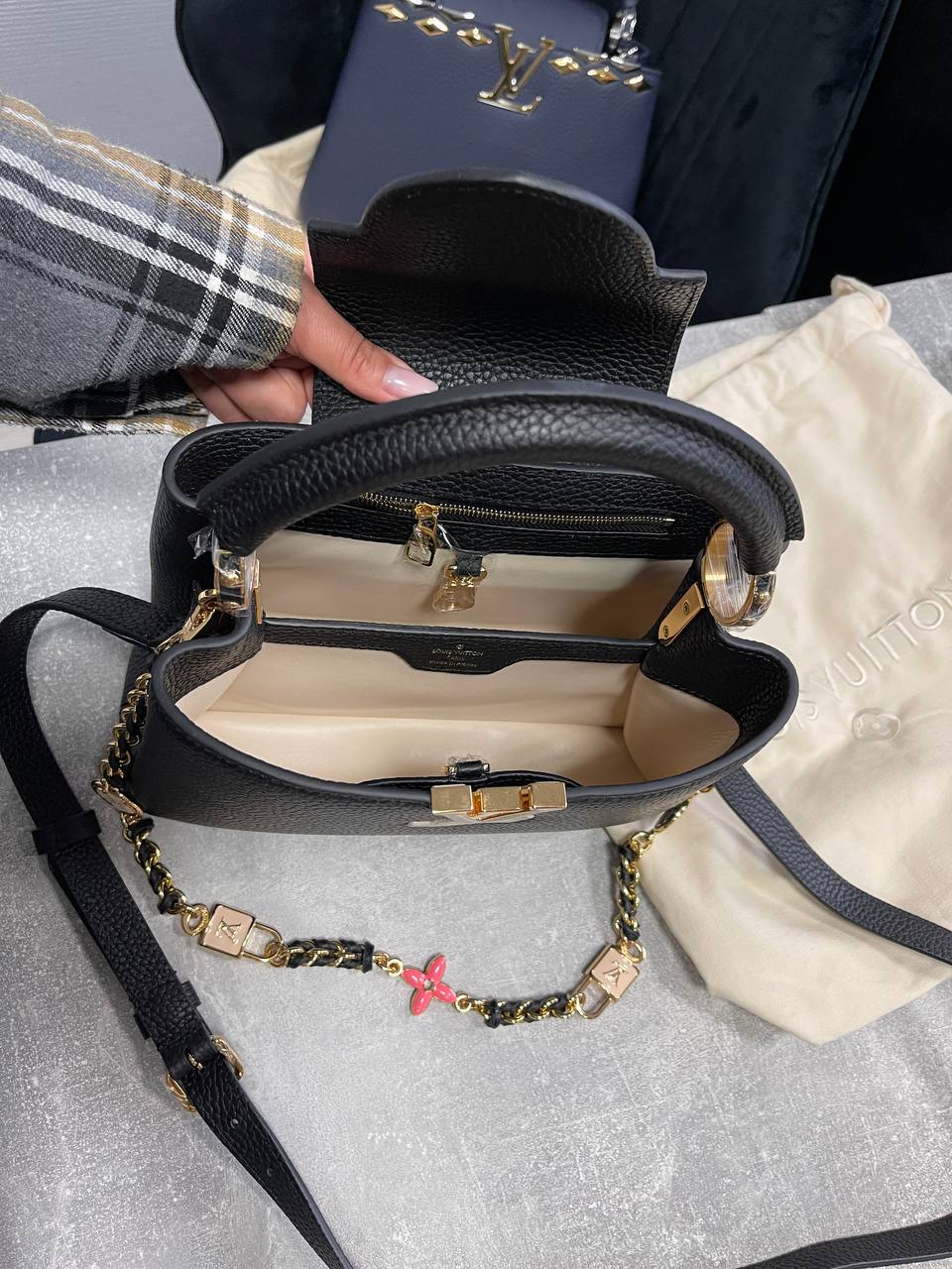 Сумка женская Louis Vuitton LUX-117119 — это элегантная модель черного цвета, выполненная в классическом стиле. Текстурированная поверхность сумки добавляет изысканности, а золотистая фурнитура и цепочка с подвесками подчеркивают ее премиальный статус. Идеально подходит для повседневного использования и особых случаев.