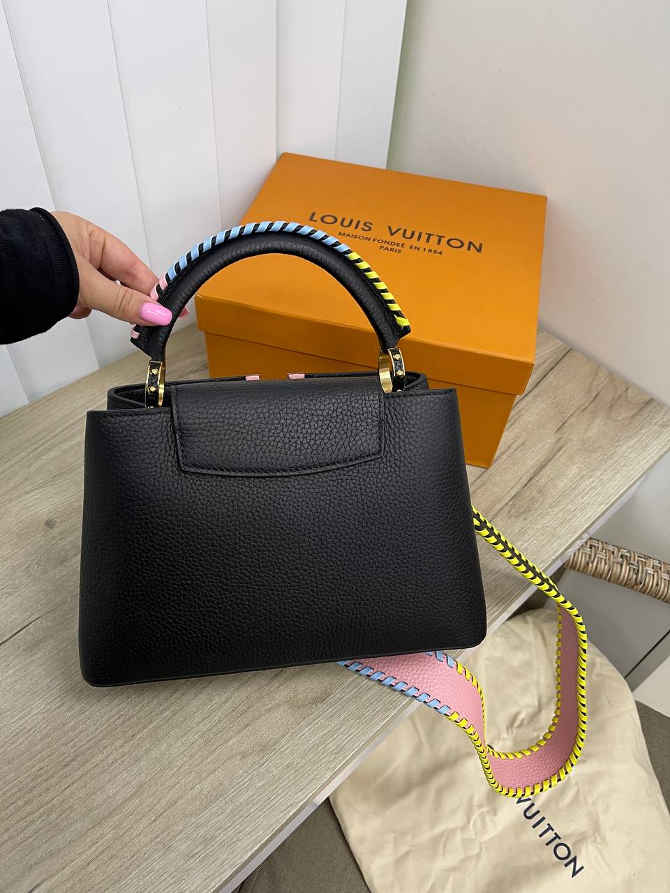 Сумка женская Capucines 20 см Louis Vuitton - роскошная сумка через плечо, изготовленная в классическом стиле. Она выполнена в черном цвете с уникальным дизайном, где элементы сумки сочетают в себе разные цвета. Это делает сумку яркой и привлекательной.