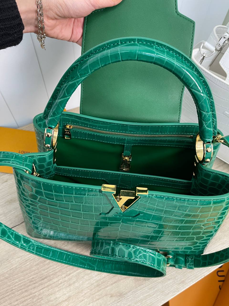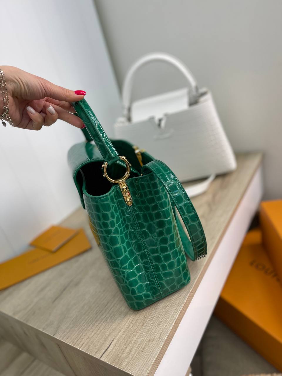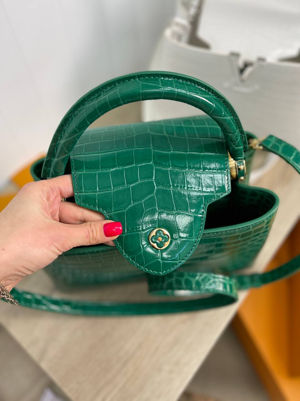 Сумка женская Capucines 30 см Louis Vuitton LUX-86116 представляет собой элегантную модель премиум-класса в насыщенном зеленом цвете. Отличительной чертой является текстура, имитирующая кожу крокодила, что придает сумке роскошный вид. Эта сумка предназначена для тех, кто ценит стиль и функциональность.