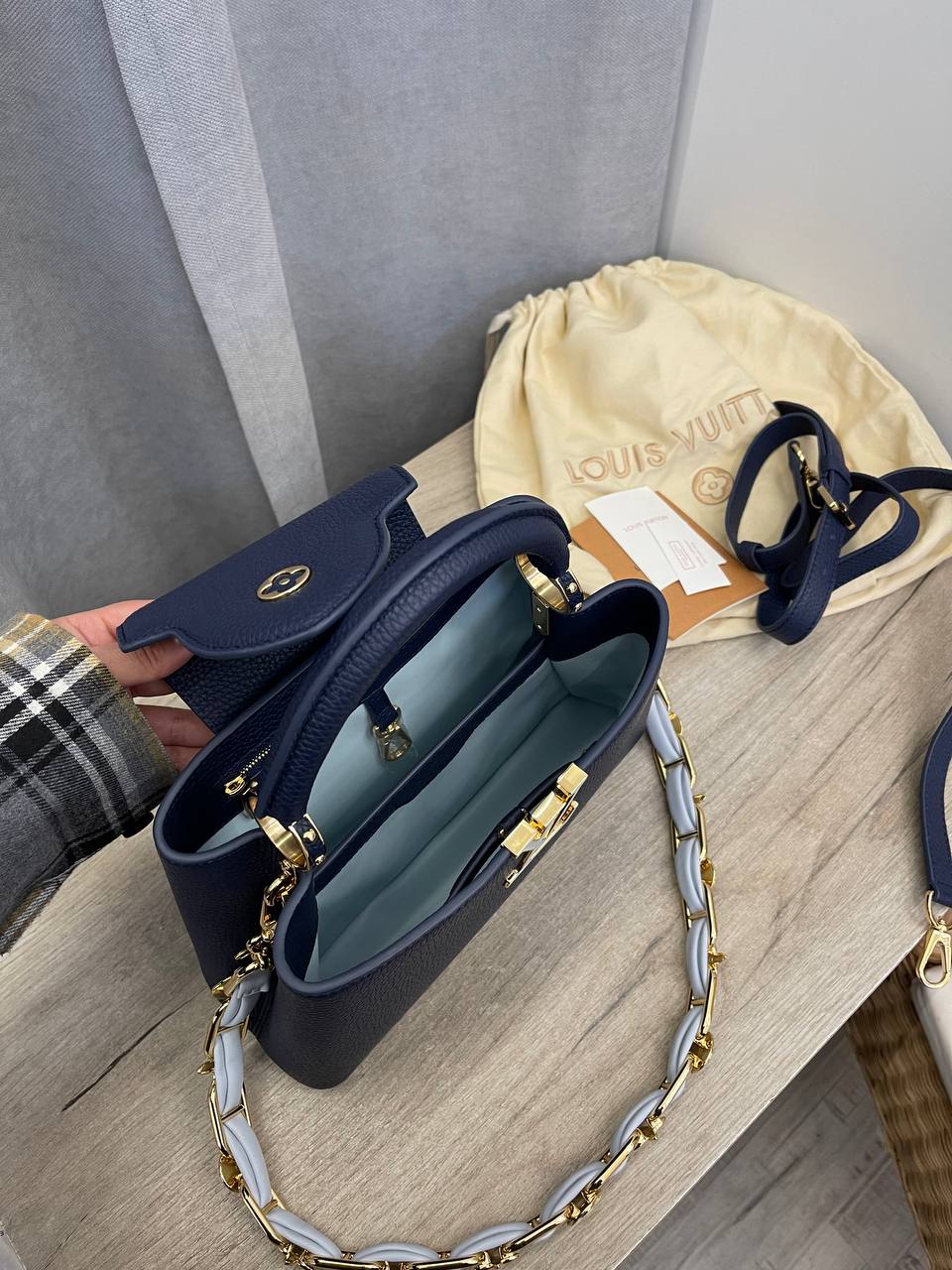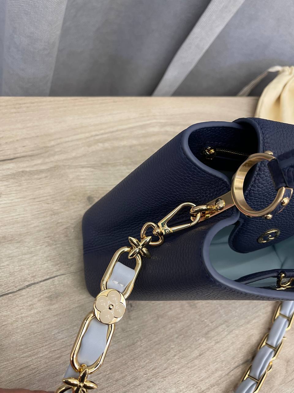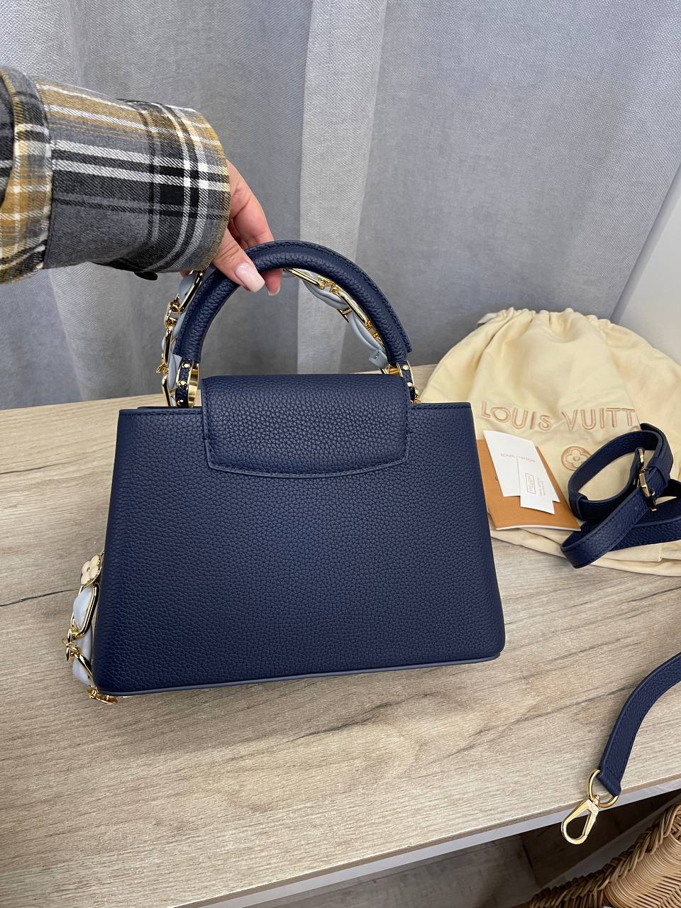 Сумка женская Capucines Louis Vuitton LUX-107218 — это элегантная модель, выполненная в классическом стиле. Она выполнена в глубоком синем цвете, имеет текстурированную поверхность. Сумка подойдет для повседневного использования и для особых случаев.