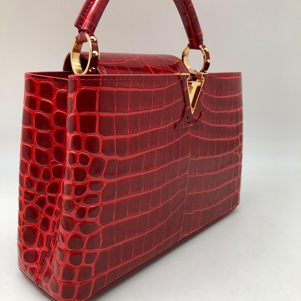 Эта элегантная женская сумка Louis Vuitton Capucines СЖ-552 выполнена в насыщенном красном цвете с фактурой под кожу рептилии. Модель отличается классическим дизайном с жесткой формой, верхней ручкой и съемным плечевым ремнем, обеспечивающим универсальность в ношении. Акцентная золотистая фурнитура с узнаваемым логотипом LV придает изделию роскошный вид. Идеально подходит для создания утонченных вечерних и деловых образов.