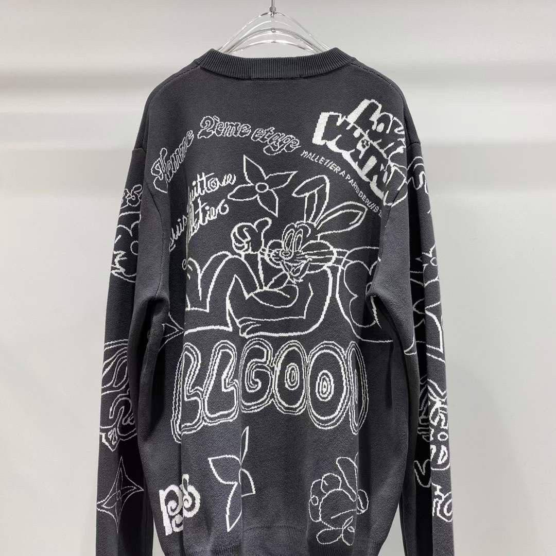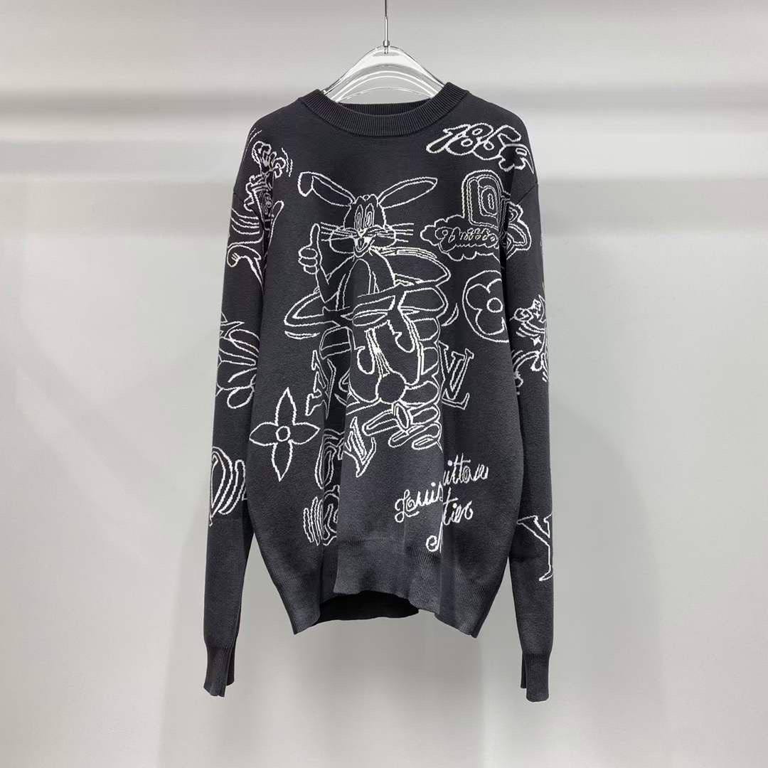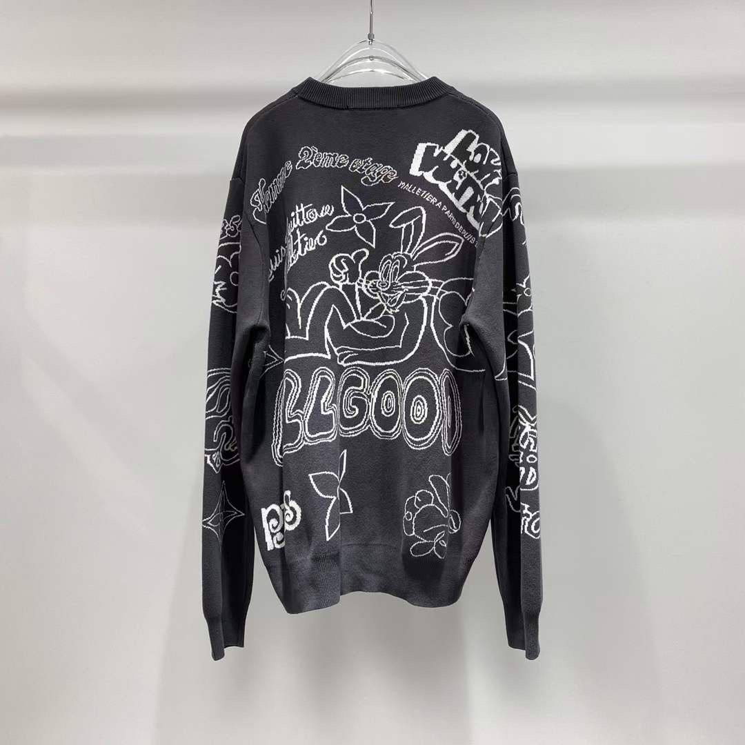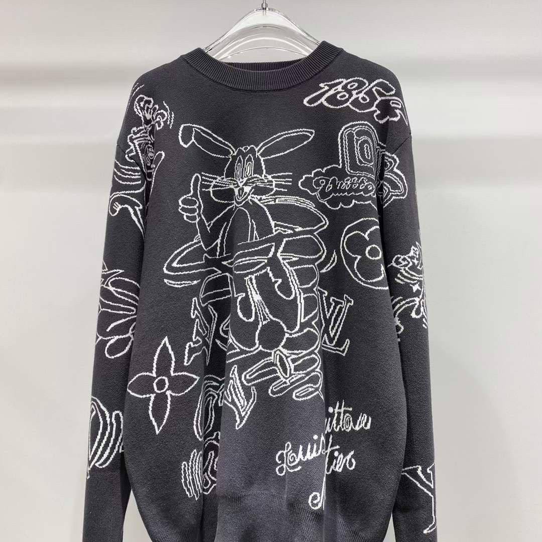 Мужской свитер Louis Vuitton LUX-96129 выполнен в классическом стиле с узнаваемым дизайном бренда. Черный свитер украшен белым принтом с изображением кролика и логотипами бренда. Текстура изделия мягкая и приятная на ощупь, что делает его идеальным выбором для повседневной носки.