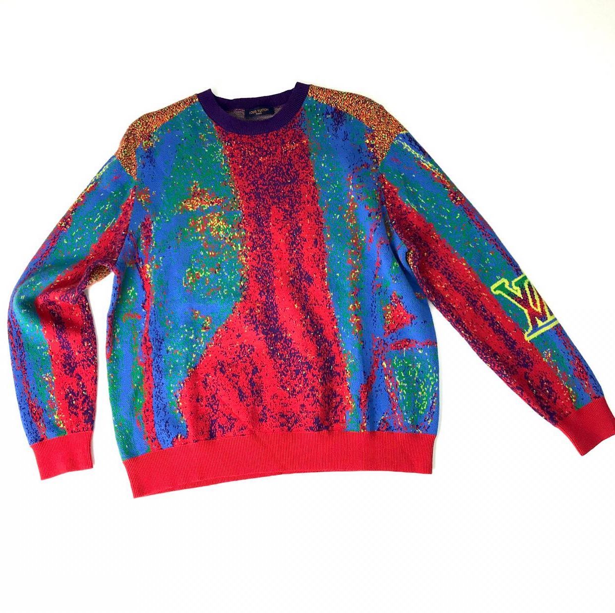 Этот яркий свитер женский Louis Vuitton LUX-35015 от Louis Vuitton — настоящее произведение искусства. Модель привлекает внимание оригинальным абстрактным принтом в насыщенных синих, красных, зеленых и фиолетовых тонах, дополненным золотистыми вкраплениями на плечах. Классический крой и контрастная красная резинка на манжетах и по низу изделия делают его стильным выбором для создания эффектных образов.