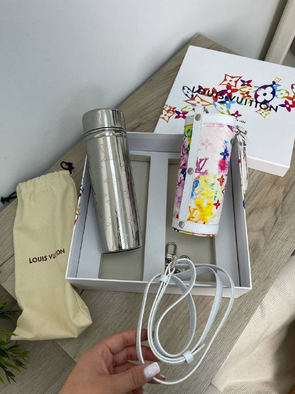 Термос Louis Vuitton LUX-51645 — это стильный и функциональный аксессуар, демонстрирующий элегантность и узнаваемый дизайн бренда. Серебристый металлический корпус с тиснением фирменным узором LV и яркая цветная отделка чехла делают этот термос настоящим модным заявлением. Он идеально подходит для тех, кто ценит изысканность в повседневных предметах.