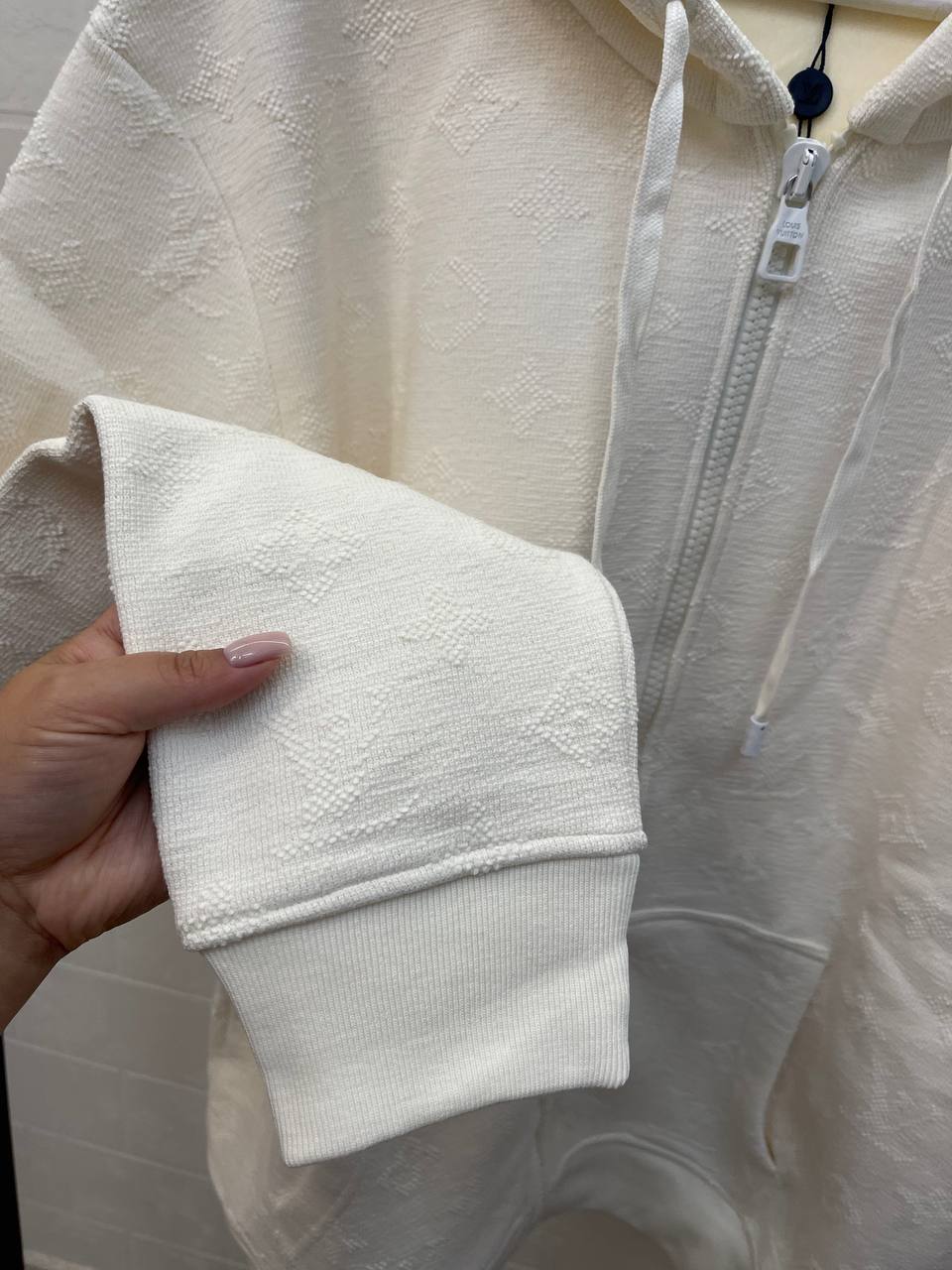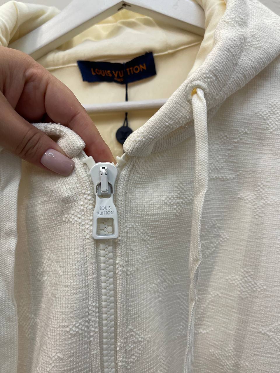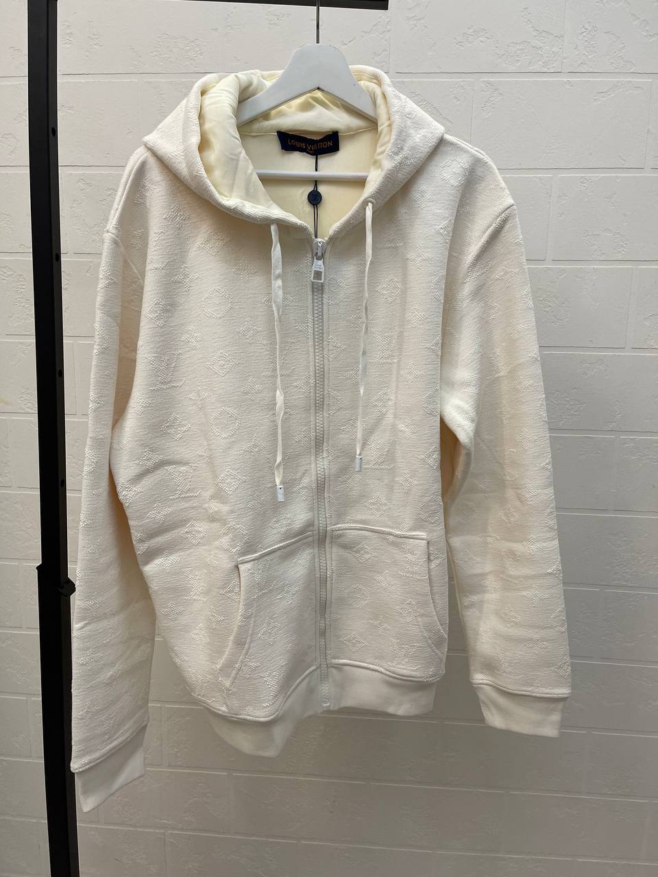 Толстовка Louis Vuitton LUX-110065 — это стильная и удобная толстовка в классическом стиле. Она выполнена в кремовом цвете с текстурированным узором, имеет капюшон и застежку-молнию. Идеально подходит для создания повседневных образов, обеспечивая комфорт и тепло в прохладную погоду.