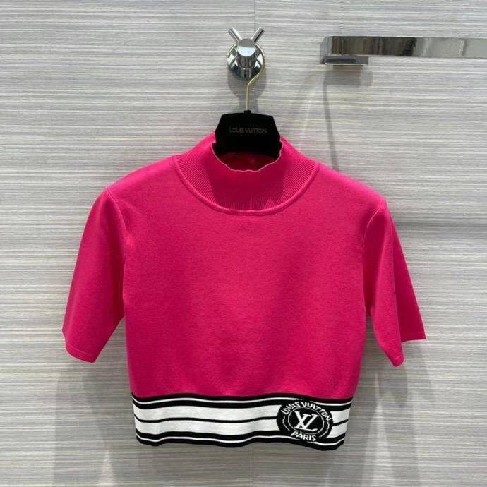 Яркий розовый кроп-топ Louis Vuitton LUX-70073 с короткими рукавами и высоким воротом. Модель украшена контрастной полосой с логотипом бренда по нижнему краю, что придает ей завершенный и стильный вид. Этот топ станет отличным дополнением к повседневному или спортивному образу.