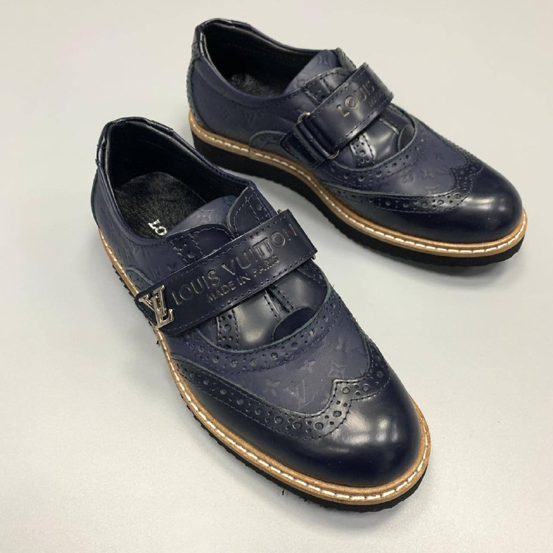 Эти стильные туфли Louis Vuitton LUX-55271 сочетают в себе классический дизайн броги и современный акцент в виде ремешка на липучке с логотипом бренда. Глубокий синий цвет и тисненый монограммный узор Louis Vuitton придают им элегантность и узнаваемость. Такая модель идеально подойдет для создания изысканных образов как для мальчиков, так и для девочек, дополняя нарядные платья или брючные костюмы.
