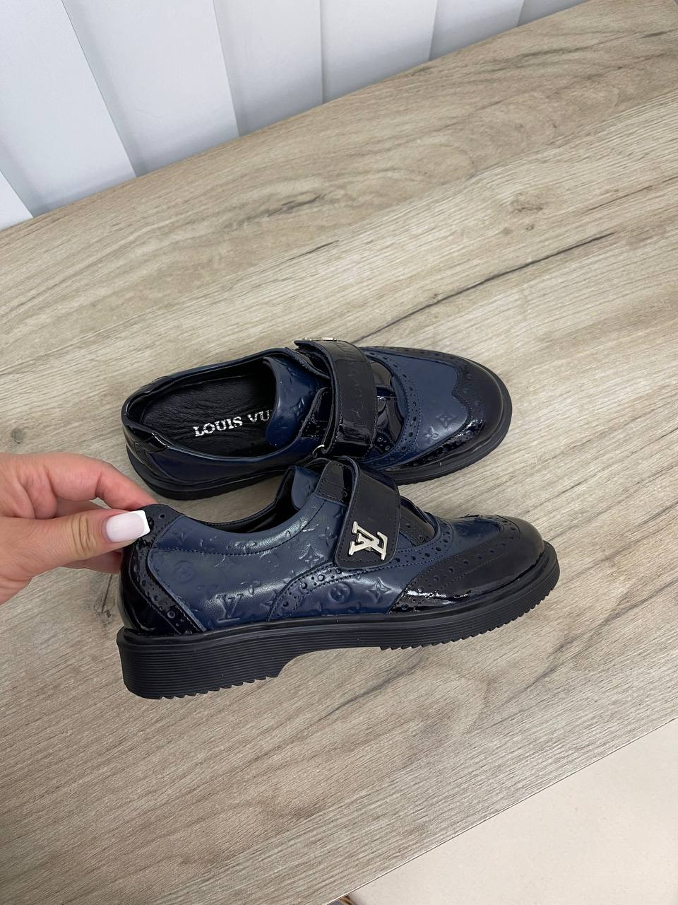 Туфли Louis Vuitton LUX-71385 — это стильная обувь для детей. Модель выполнена в темно-синем цвете с глянцевой текстурой и украшена фирменной монограммой Louis Vuitton. Эти туфли идеально подойдут для повседневной носки и для особых случаев, добавляя образу элегантность и изысканность.