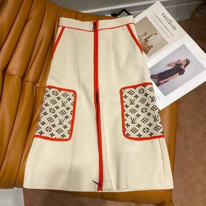 Эта элегантная юбка Louis Vuitton LUX-64084 выполнена в стиле смарт-кэжуал, идеально подходящем для создания как повседневных, так и более изысканных образов. Её кремовый цвет с контрастной красной отделкой и узнаваемым монограммным принтом на карманах придает ей особый шарм.