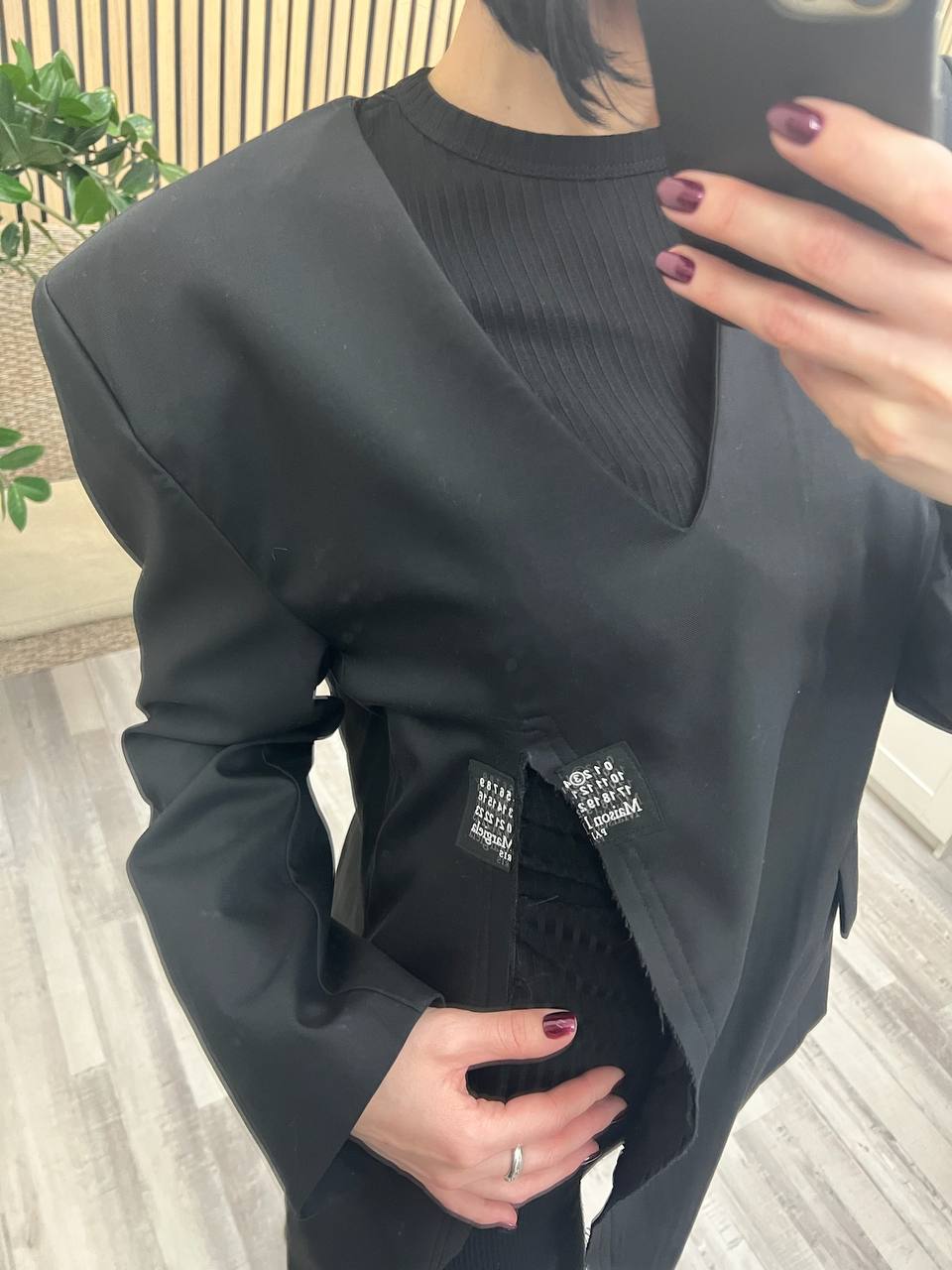 Жакет Maison Margiela LUX-102187 — это стильный и современный предмет гардероба. Жакет чёрного цвета, имеет глубокий V-образный вырез и свободный крой. Он идеально подойдет для создания как повседневных, так и более формальных образов.