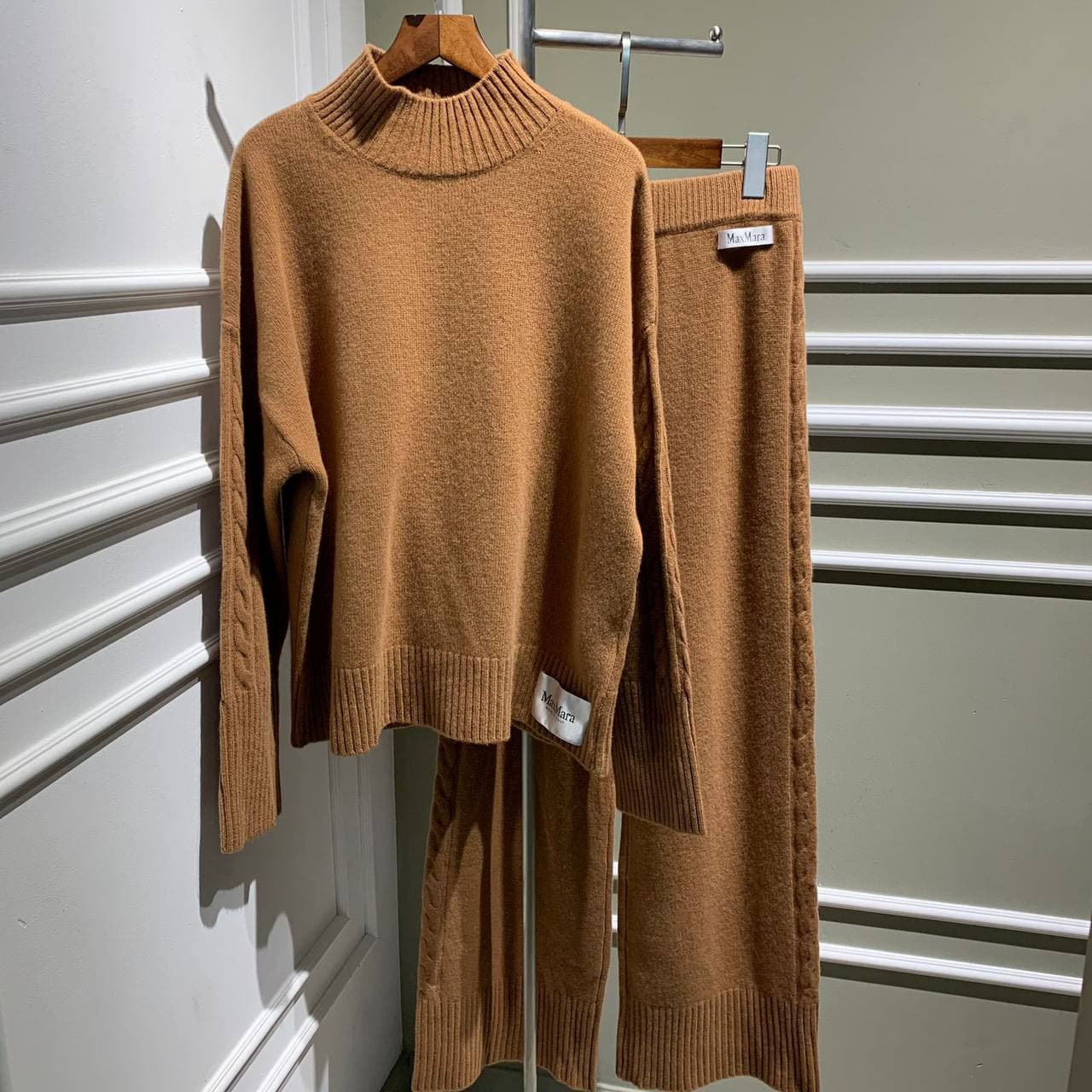 Этот спортивный костюм Max Mara LUX-58141 представляет собой элегантный и комфортный выбор для современного гардероба. Комплект состоит из джемпера с высоким воротником и прямых брюк, выполненных в едином карамельном оттенке. Детали, такие как вязаные узоры на рукавах и минималистичные логотипы бренда, добавляют изысканности.
