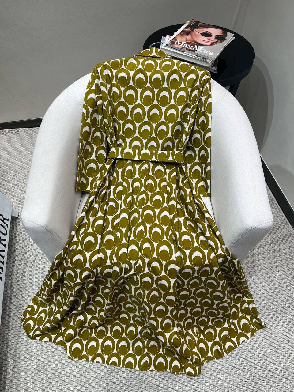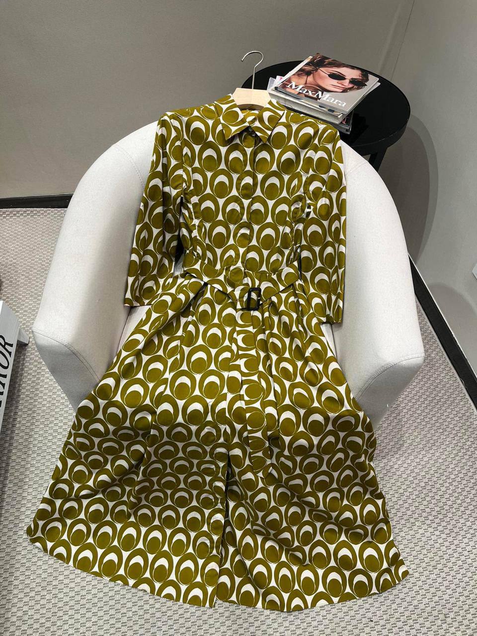 Платье Max Mara LUX-107634 - это стильное платье в ретро-стиле с ярким принтом. Платье выполнено в оливковом цвете с геометрическим узором, имеет длинные рукава и пояс, подчеркивающий талию. Идеально подойдет для создания эффектного образа в повседневной жизни или на мероприятии.