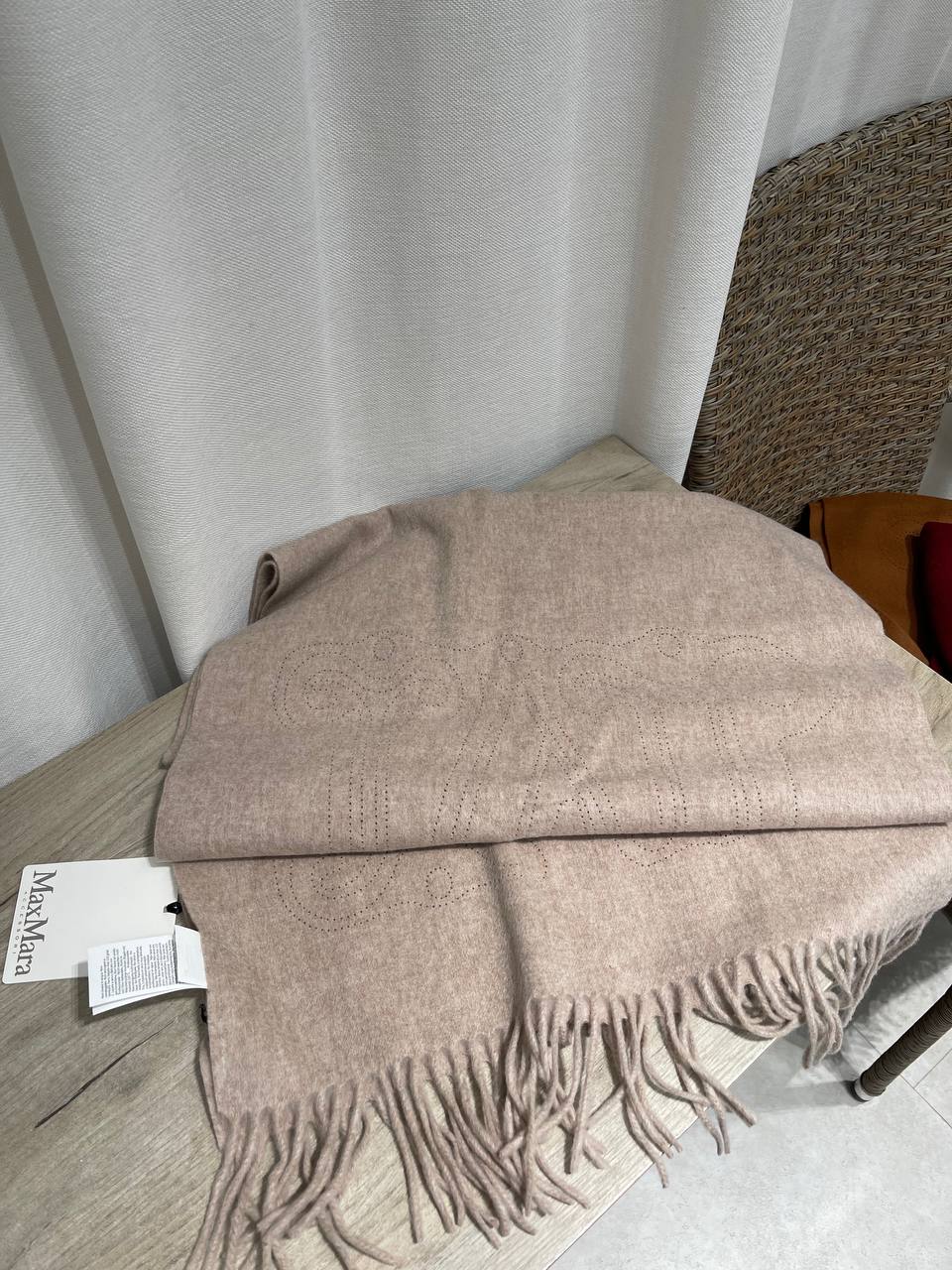 Шарф Max Mara – это элегантный аксессуар, который добавит изысканности в ваш образ. Он выполнен в нежном пудровом оттенке и украшен бахромой, что придает ему особый шарм.