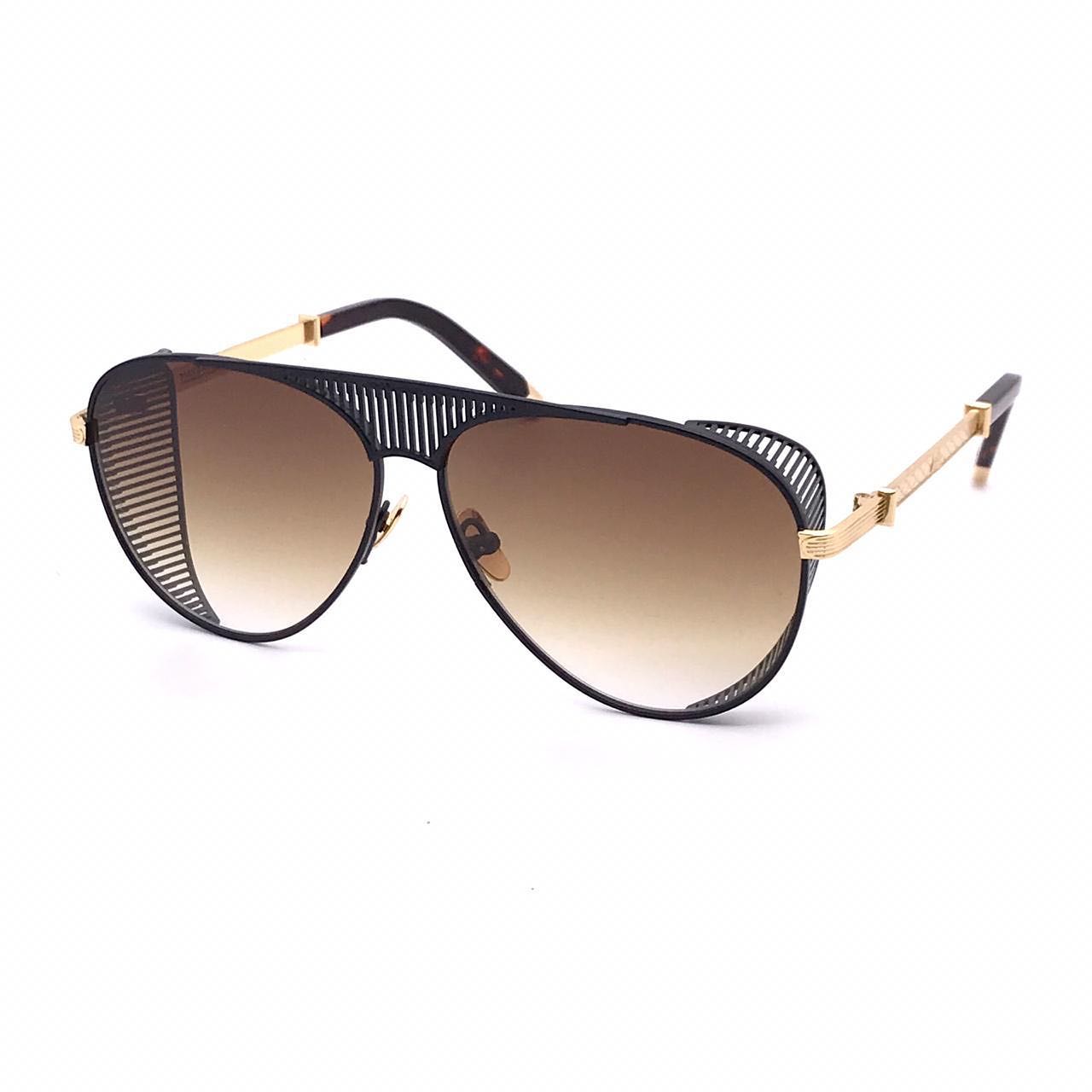 Стильные очки Maybahce LUX-43483 представлены в уникальном дизайне, сочетающем классическую форму "авиатор" с современными элементами. Черная металлическая оправа с золотистыми вставками и декоративными полосками по бокам придает модели роскошный и эксклюзивный вид. Коричневые градиентные линзы обеспечивают отличную защиту от солнца и создают эффектный образ. Эти очки идеально подойдут для тех, кто ценит оригинальность и высокое качество.