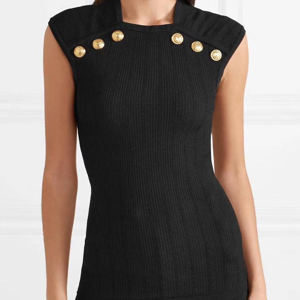 Стильная женская майка LUX-11616 от LUXE, выполненная в классическом черном цвете, станет отличным дополнением к вашему гардеробу. Майка имеет приталенный силуэт и круглый вырез горловины. Декоративные золотистые пуговицы на плечах придают ей особый шик и элегантность. Изделие прекрасно подойдет для создания как повседневных, так и более нарядных образов.