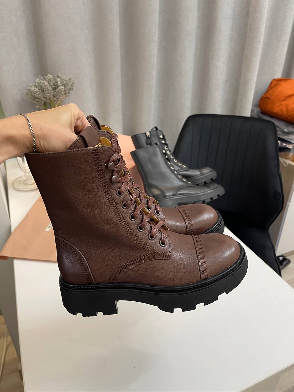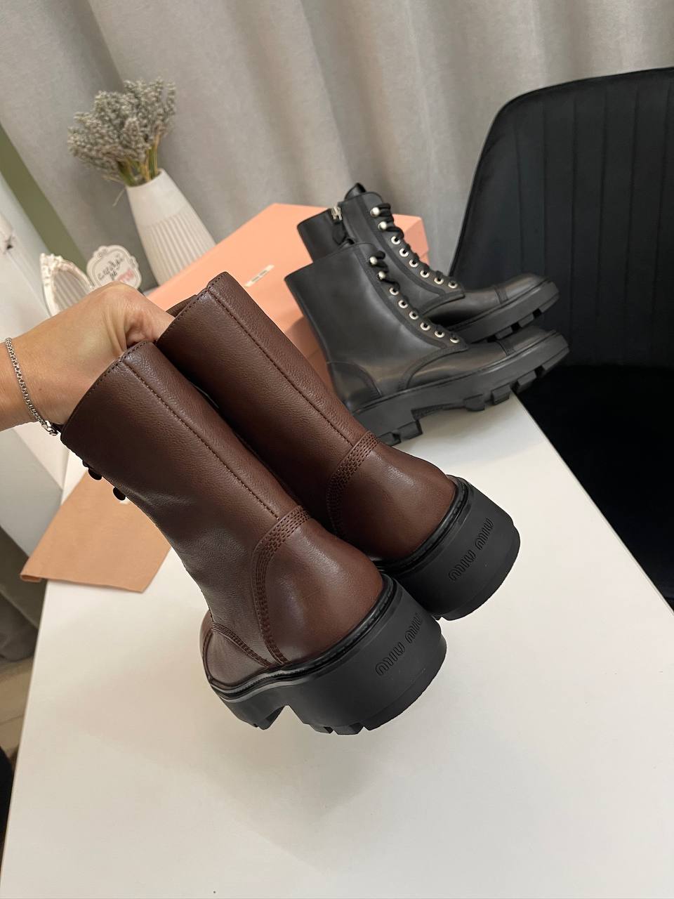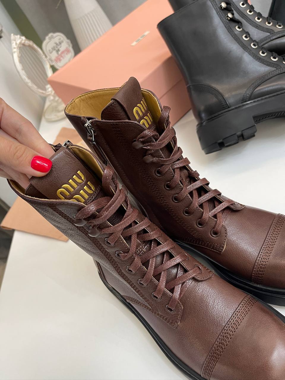 Ботинки Miu Miu LUX-110577, представленные на изображении, представляют собой стильную обувь в современном стиле. Ботинки выполнены в коричневом цвете, имеют текстурированную поверхность. Идеально подходят для повседневной носки, добавляя образу нотку элегантности и смелости.