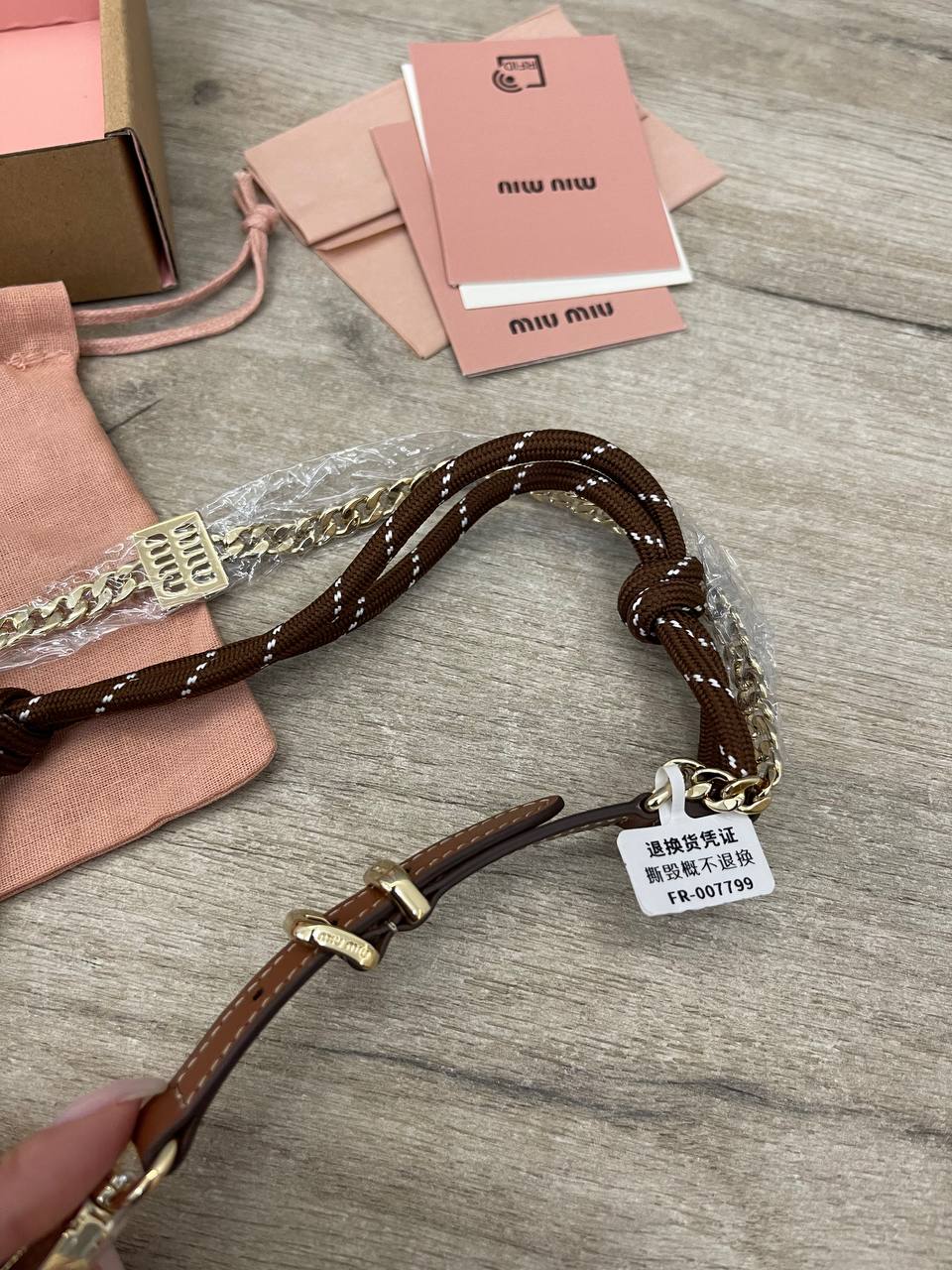 Брелок Miu Miu LUX-107363 - стильный аксессуар, который добавит изысканности вашему образу. Данный брелок выполнен в сочетании коричневых оттенков, с золотистой фурнитурой и подвеской с логотипом бренда. Его можно использовать как украшение для сумки, ключей или просто как модный акцент.