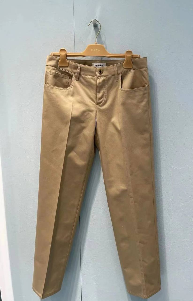 Брюки Miu Miu LUX-109038, представленные на изображении, — это стильные и элегантные брюки. Брюки прямого кроя, выполнены в однотонном песочном цвете, что делает их универсальными для создания различных образов. Ткань имеет легкий блеск, что придает изделию изысканность.
