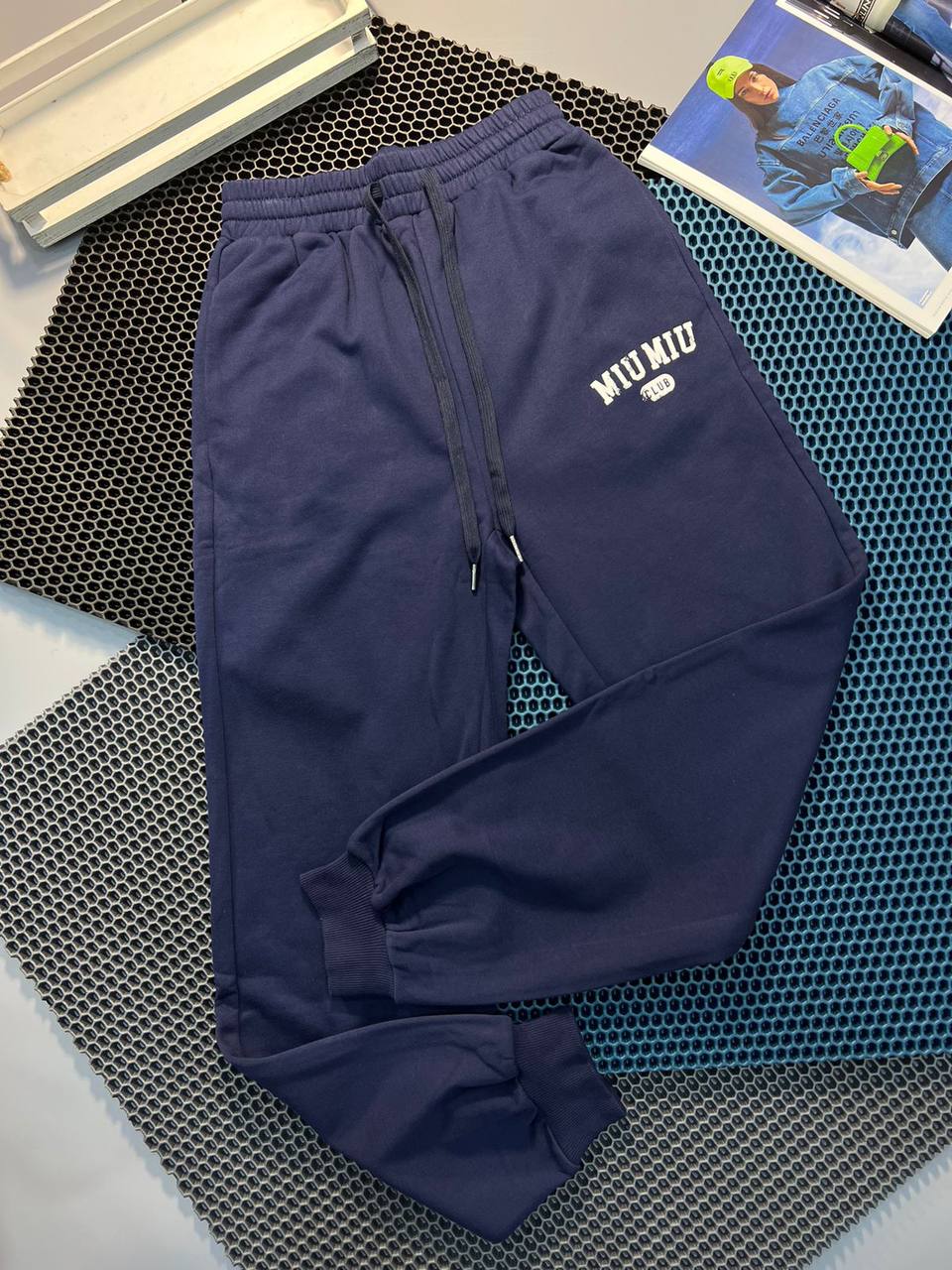 Брюки Miu Miu LUX-77221 - это стильные спортивные брюки в темно-синем цвете, выполненные в современном стиле. Брюки имеют прямой крой с манжетами на щиколотках и шнурком на талии для регулировки посадки. На левой штанине расположен логотип бренда.
