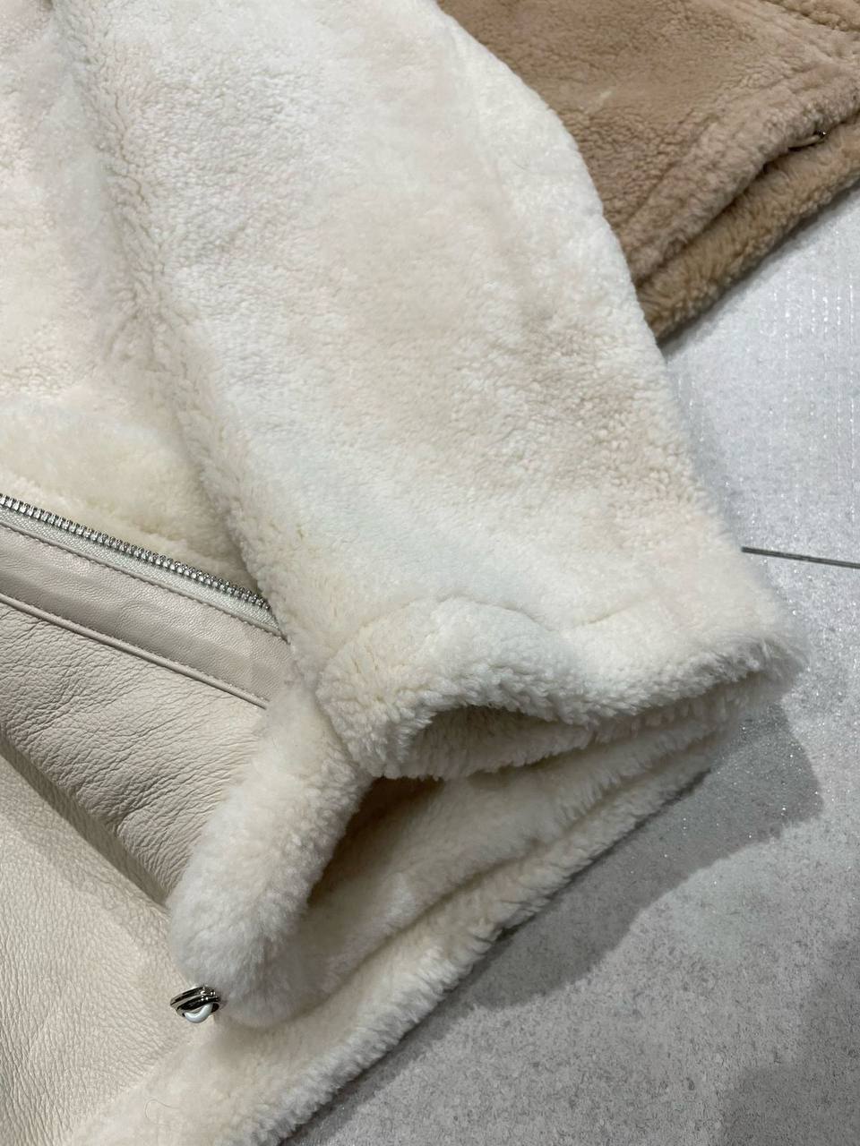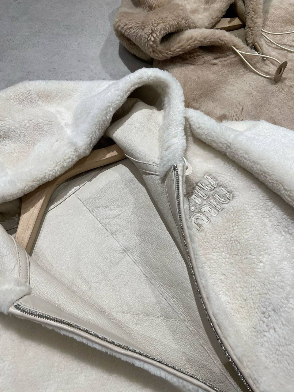 Стильная дубленка Miu Miu – воплощение утонченного комфорта и модного стиля. Модель выполнена в нежном бежевом цвете и идеально подойдет для создания уютных и элегантных образов.