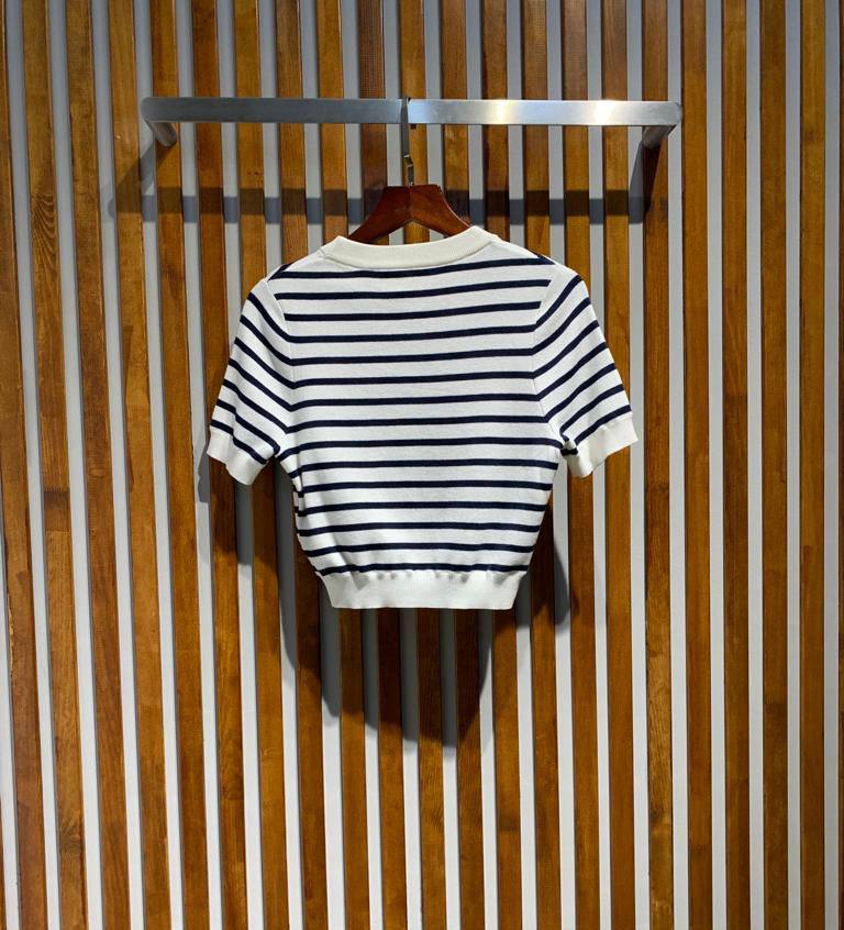 Футболка Miu Miu LUX-93964 — это стильная женская футболка в классическом стиле. Она выполнена в белом цвете с темно-синими полосками. Футболка имеет короткие рукава и круглый вырез горловины.