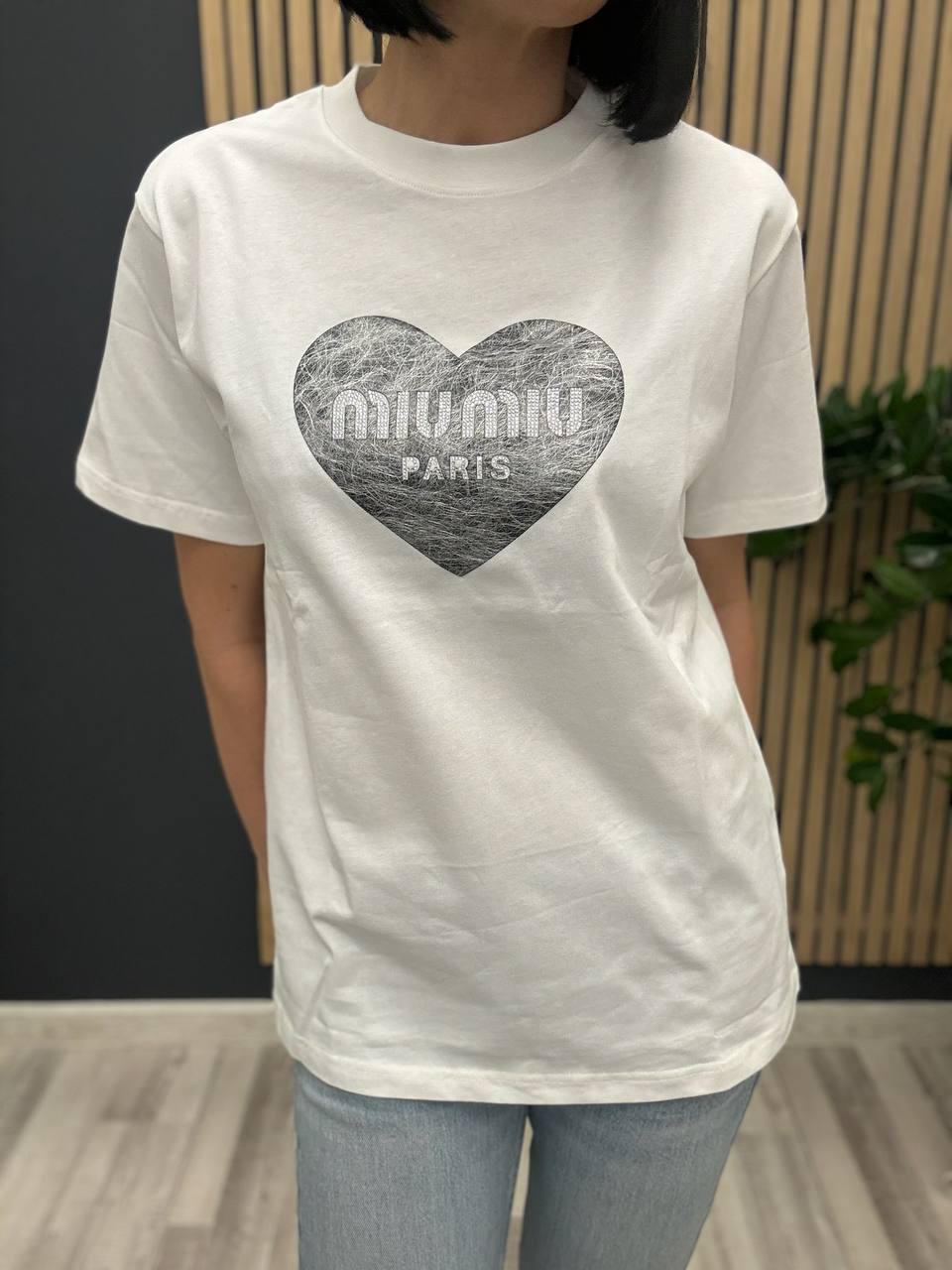 Футболка Miu Miu LUX-104066 представляет собой стильный предмет гардероба. Она выполнена в классическом белом цвете с ярким акцентом в виде принта в форме сердца. Эта футболка идеально подойдет для создания повседневных образов.