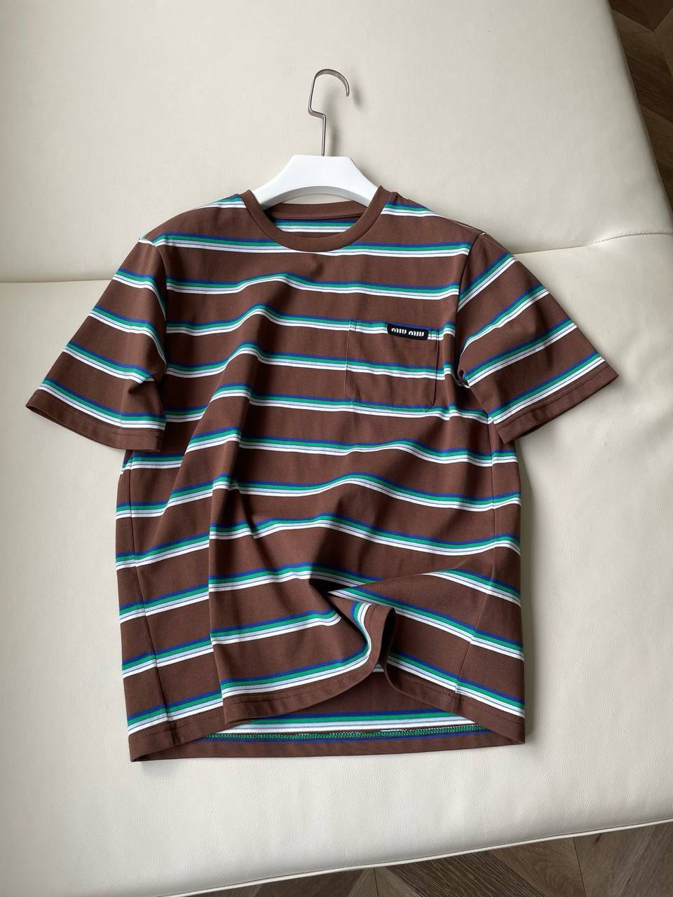 Футболка Miu Miu LUX-104090 представляет собой стильный предмет гардероба в повседневном стиле. Футболка выполнена в полоску коричневого, белого и бирюзового цветов. Отличный выбор для создания комфортного и модного образа.