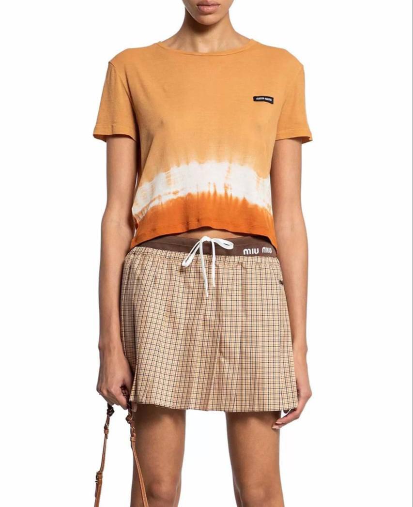 Футболка Miu Miu LUX-107814 – это стильный предмет гардероба, который сочетает в себе современный дизайн и комфорт. Футболка выполнена в оранжевом цвете с эффектом тай-дай. Эта футболка станет отличным выбором для создания повседневных образов.