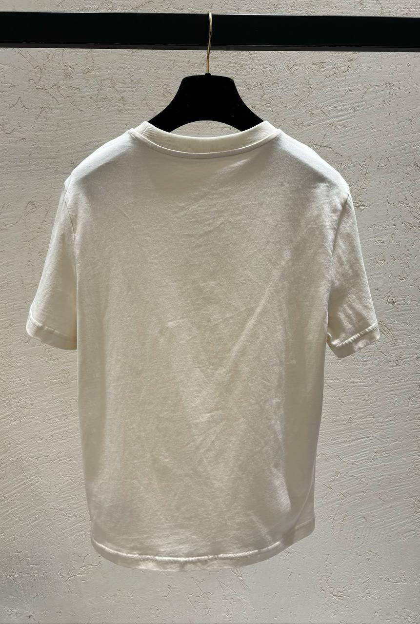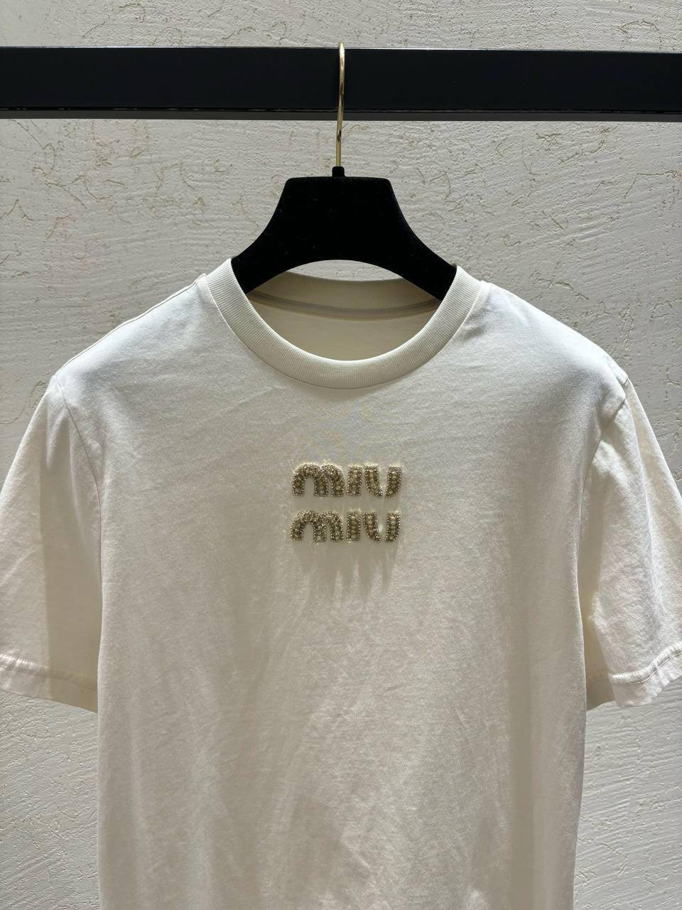 Футболка Miu Miu LUX-115469 – это стильная футболка от известного бренда, выполненная в классическом стиле. Футболка кремового цвета, с круглым вырезом и короткими рукавами, украшена выложенным стразами логотипом бренда. Такая футболка отлично подойдет для создания повседневных образов.