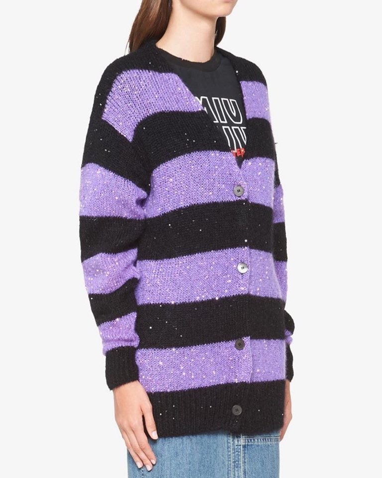 Кардиган Miu Miu LUX-21034 представляет собой яркий и стильный элемент гардероба, выполненный в контрастную полоску. Модель сочетает в себе классический крой кардигана с современными деталями, такими как блестящие вкрапления, придающие изделию оригинальность. Этот кардиган отлично подойдет для создания как повседневных, так и более нарядных образов, добавляя индивидуальности.