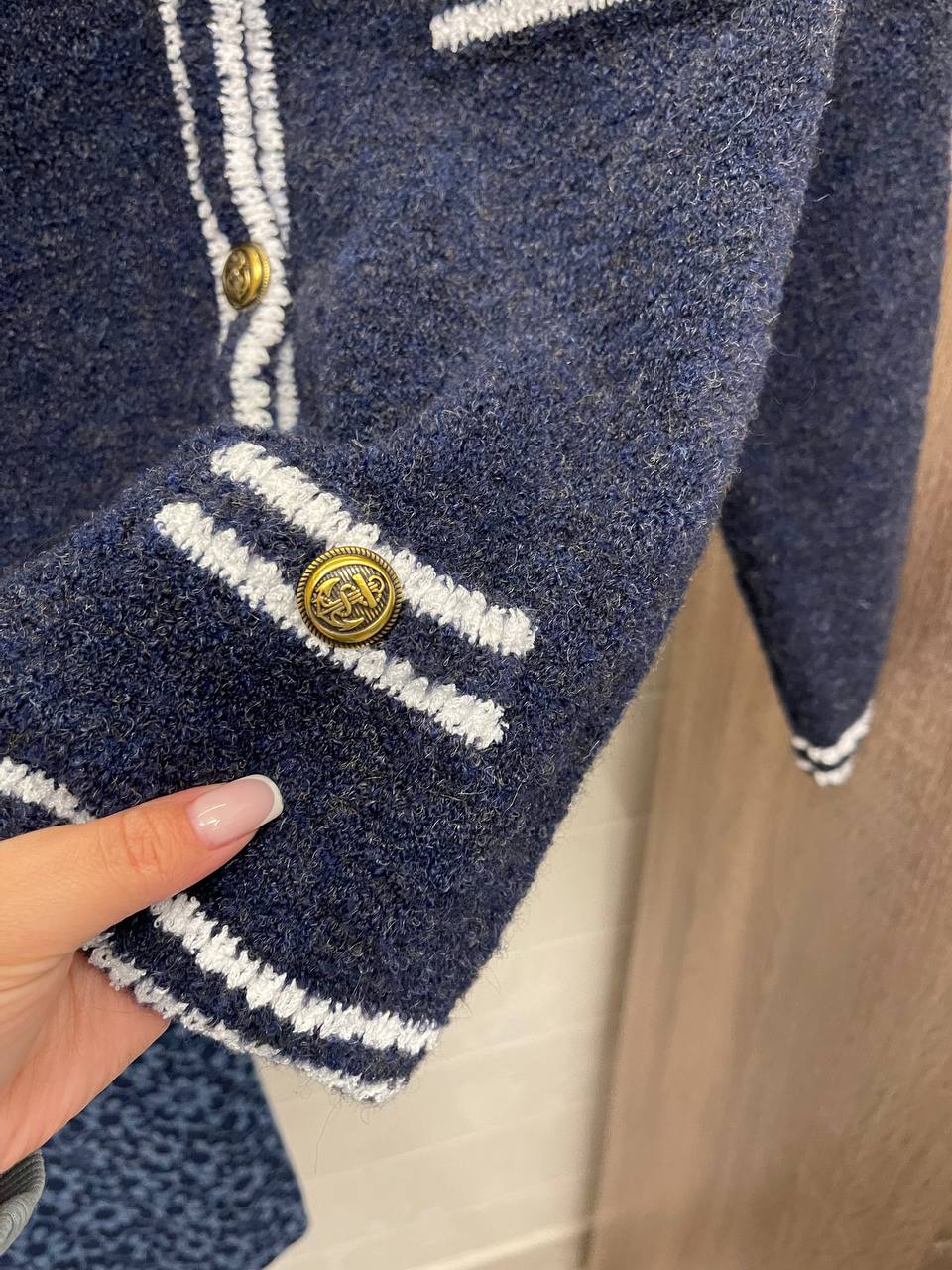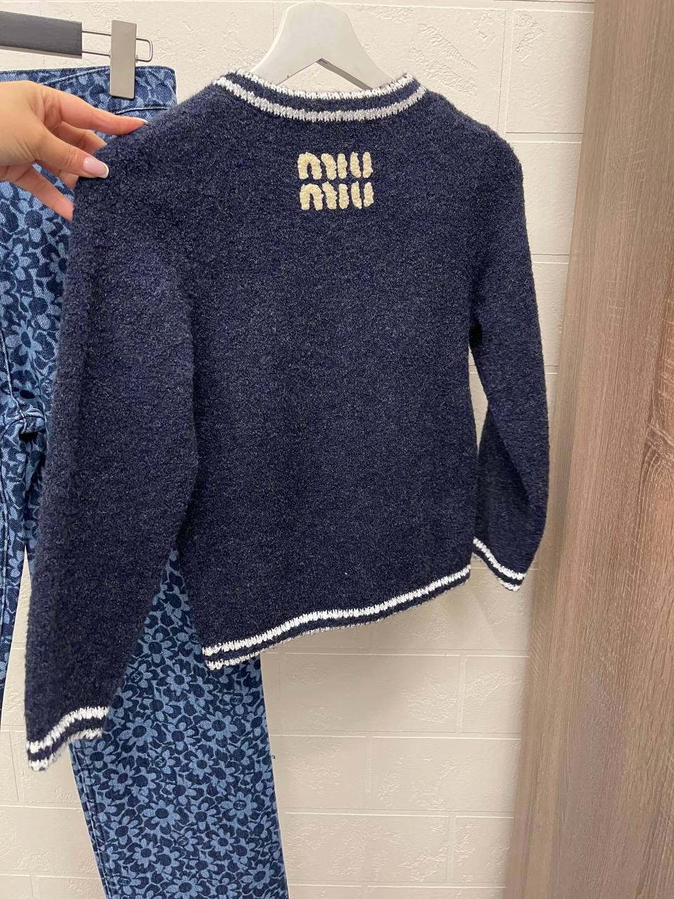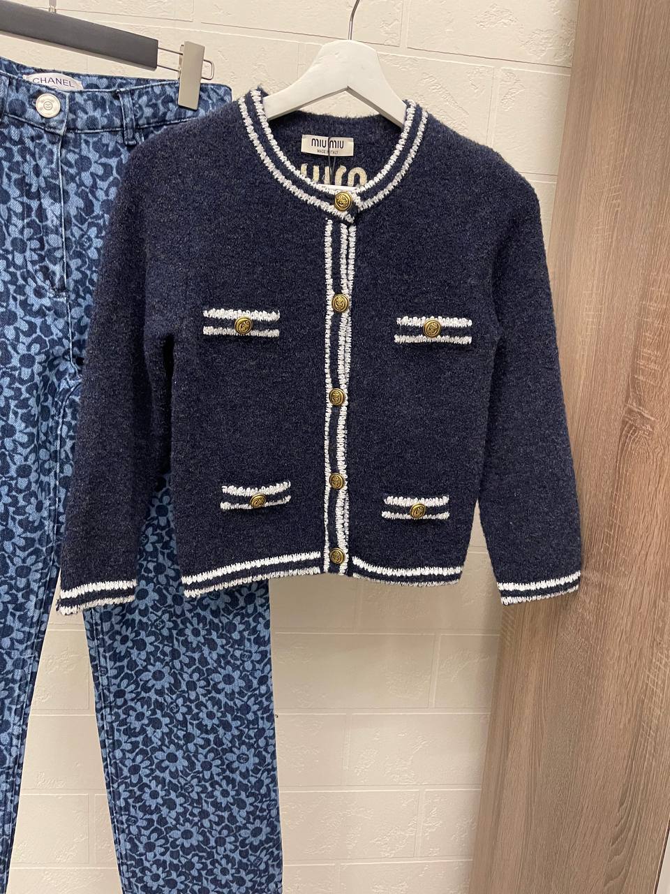 Кардиган Miu Miu LUX-111996 - это стильный элемент гардероба, который подойдет для создания элегантных образов. Кардиган темно-синего цвета с белыми контрастными деталями и золотистыми пуговицами, что придает ему особый шарм. Отлично подойдет для повседневной носки или для особых случаев.