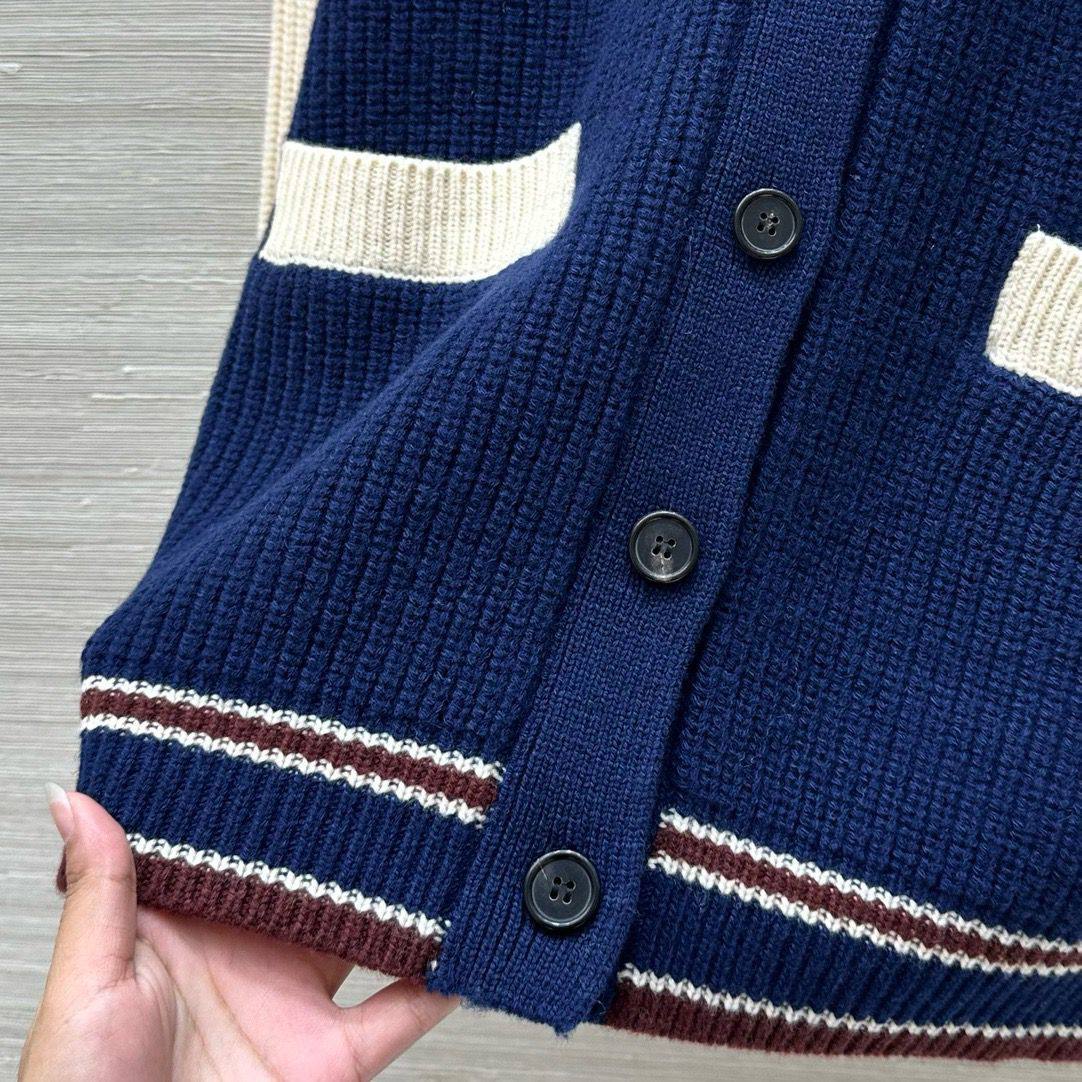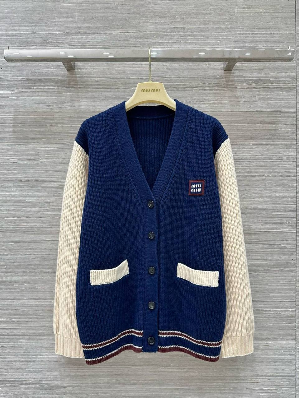 Кардиган Miu Miu LUX-113140 представляет собой стильную модель в спортивном стиле. Кардиган выполнен в темно-синем цвете с контрастными кремовыми рукавами и деталями. Он имеет свободный крой, что делает его идеальным для повседневной носки.