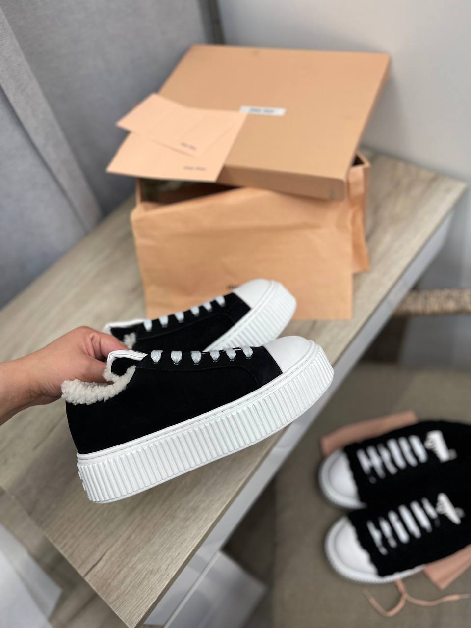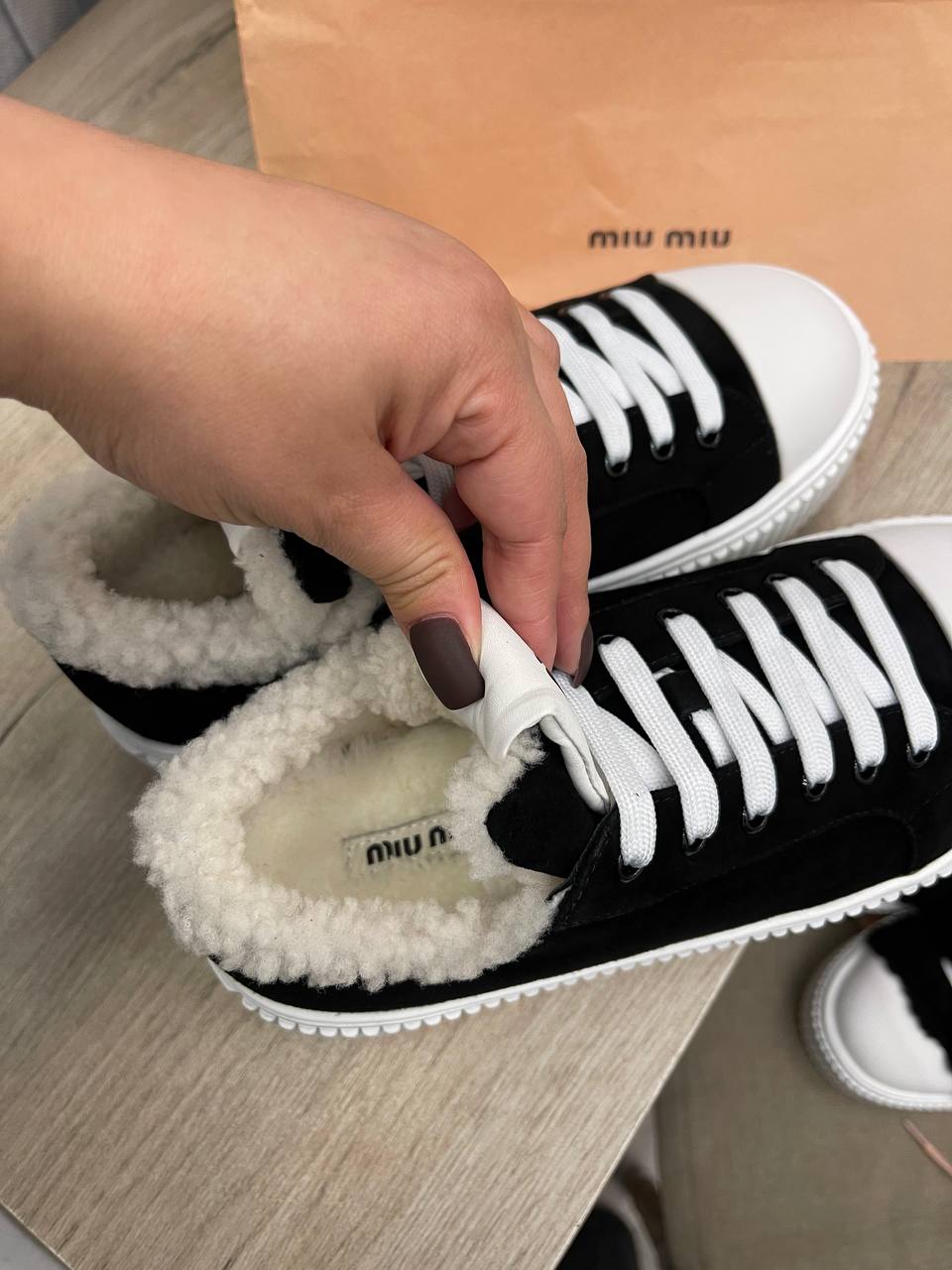Кеды Miu Miu LUX-97041 представляют собой стильную и комфортную обувь для повседневной носки. Чёрные кеды с белой подошвой и меховой отделкой внутри обеспечивают тепло и уют в прохладную погоду. Элегантный дизайн делает их подходящими для различных образов.