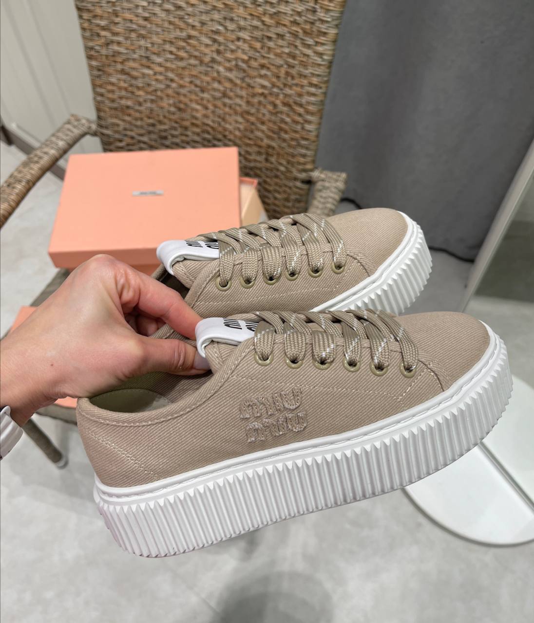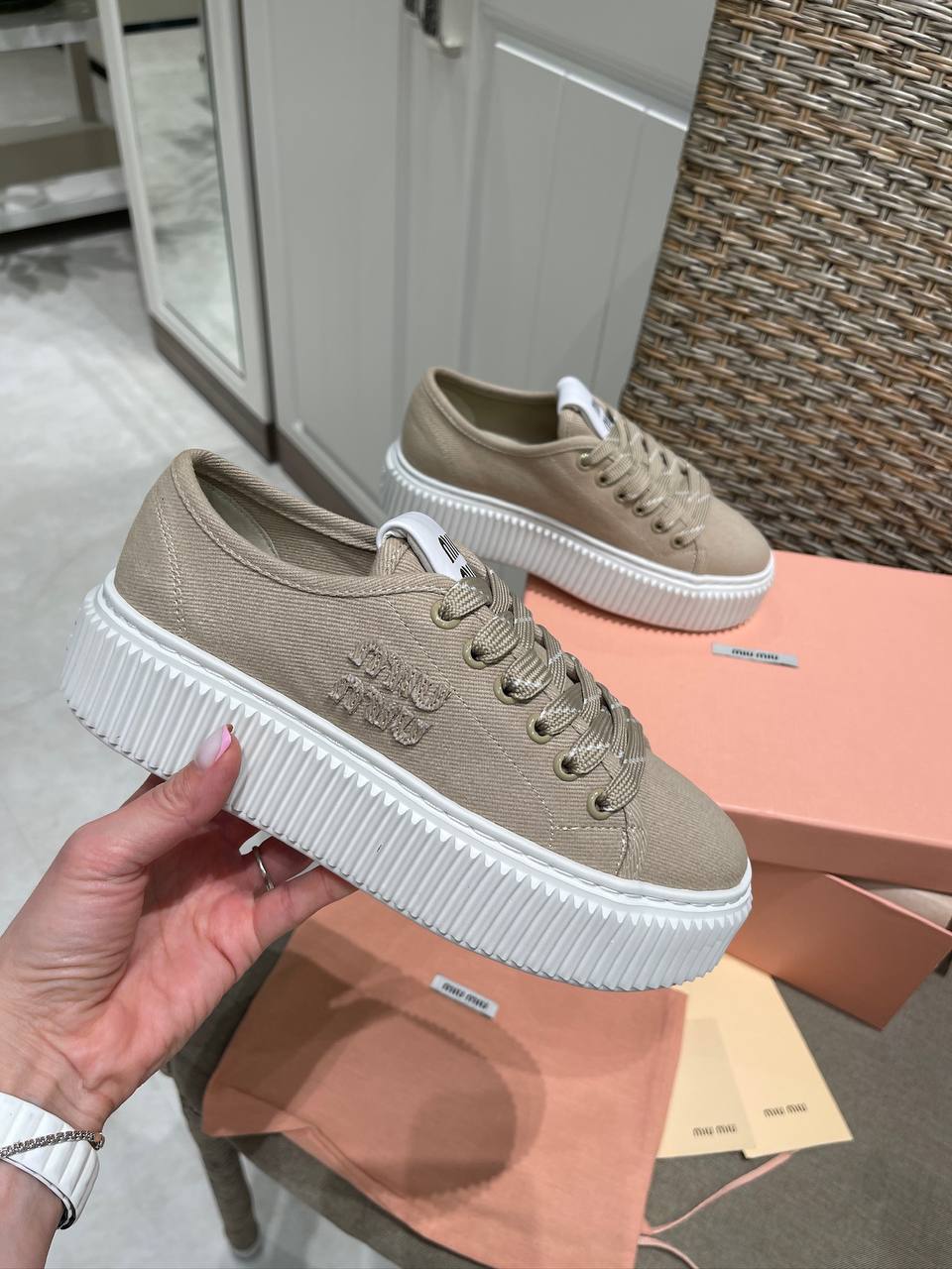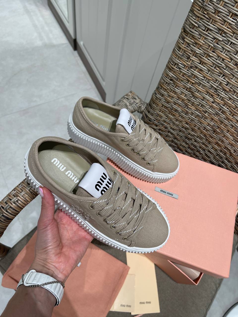 Кеды женские Miu Miu LUX-118083 – это стильная и удобная обувь от известного бренда, сочетающая в себе элегантность и повседневный комфорт. Кеды выполнены в нейтральном бежевом цвете с белой подошвой, что делает их универсальными для различных образов. Текстильная текстура верха придает им особый шарм.