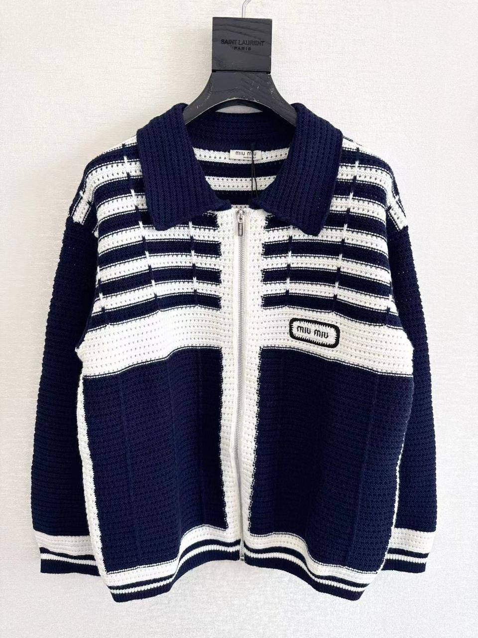 Кофта Miu Miu LUX-113273 — это стильная кофта в морском стиле от известного бренда. Кофта выполнена в темно-синем и белом цветах, с полосатым узором и контрастными деталями. Она идеально подходит для создания модных и комфортных образов.