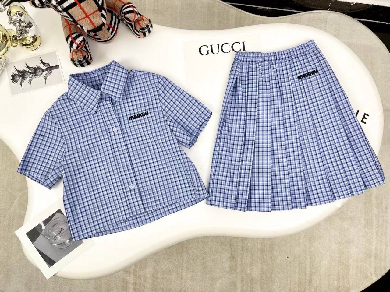 Комплект Miu Miu LUX-117049 - это стильный ансамбль в клетчатом дизайне, предназначенный для девочек. Комплект состоит из рубашки с короткими рукавами и юбки, выполненных в сине-белой цветовой гамме. Этот наряд идеально подойдет для повседневной носки, создавая яркий и запоминающийся образ.