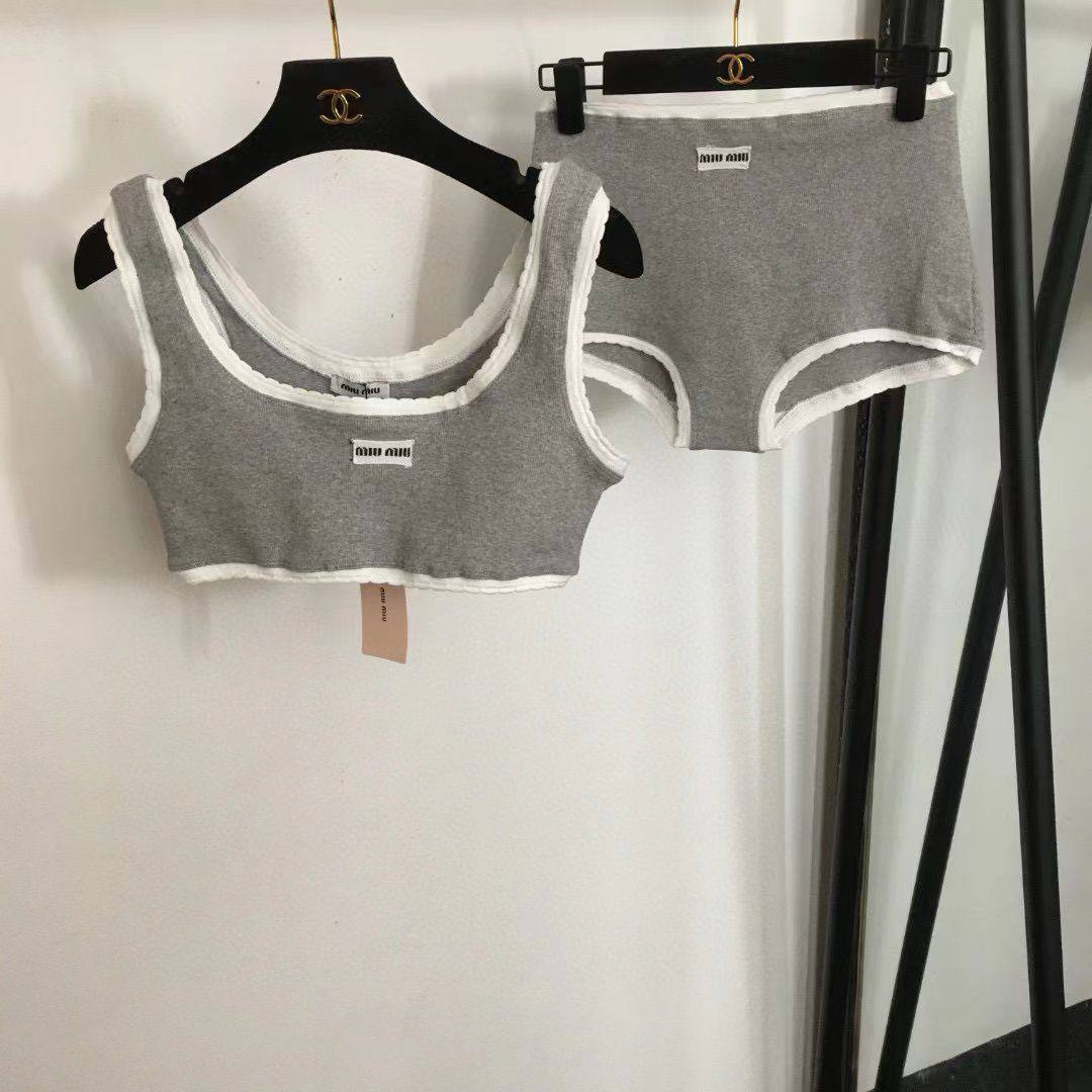 Комплект Miu Miu LUX-105057 - это воплощение современной элегантности и комфорта от известного бренда. Комплект состоит из топа и трусиков в спокойных серых тонах с минималистичным логотипом. Данный комплект идеально подойдет для создания стильного и расслабленного образа, подчеркивающего индивидуальность.
