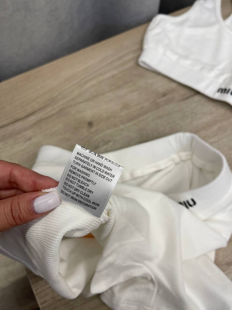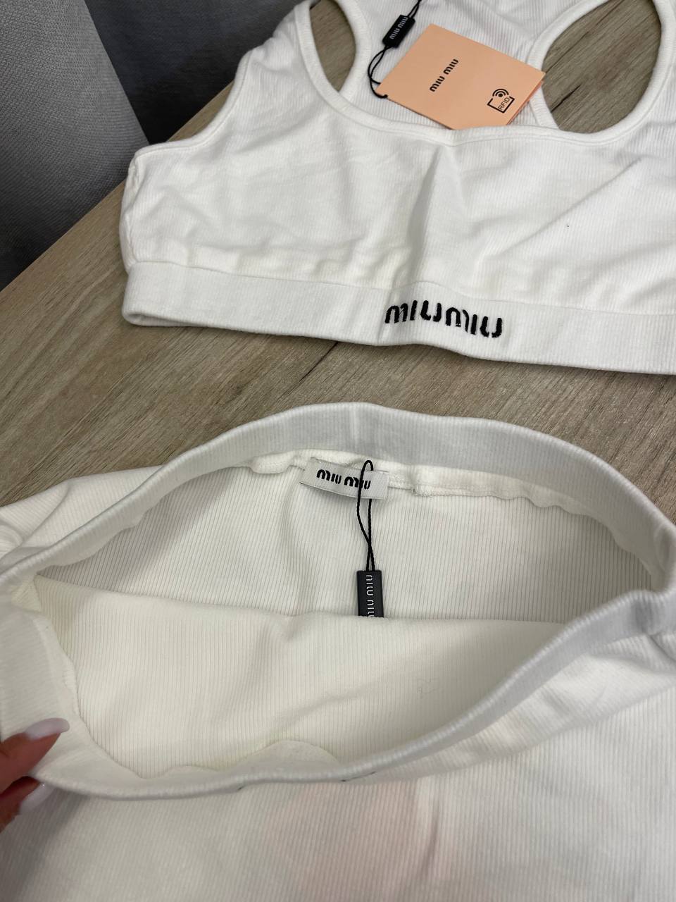 Комплект Miu Miu LUX-106561 представляет собой стильный и комфортный наряд для повседневной носки. Он выполнен в белом цвете, что делает его универсальным для сочетания с различными элементами гардероба. Комплект состоит из топа-борцовки и шорт, идеально подходящих для летнего сезона.